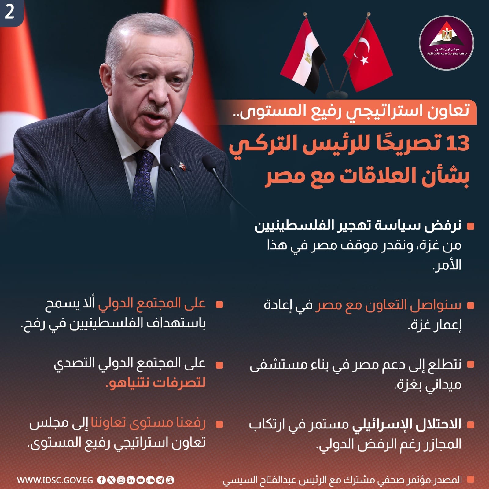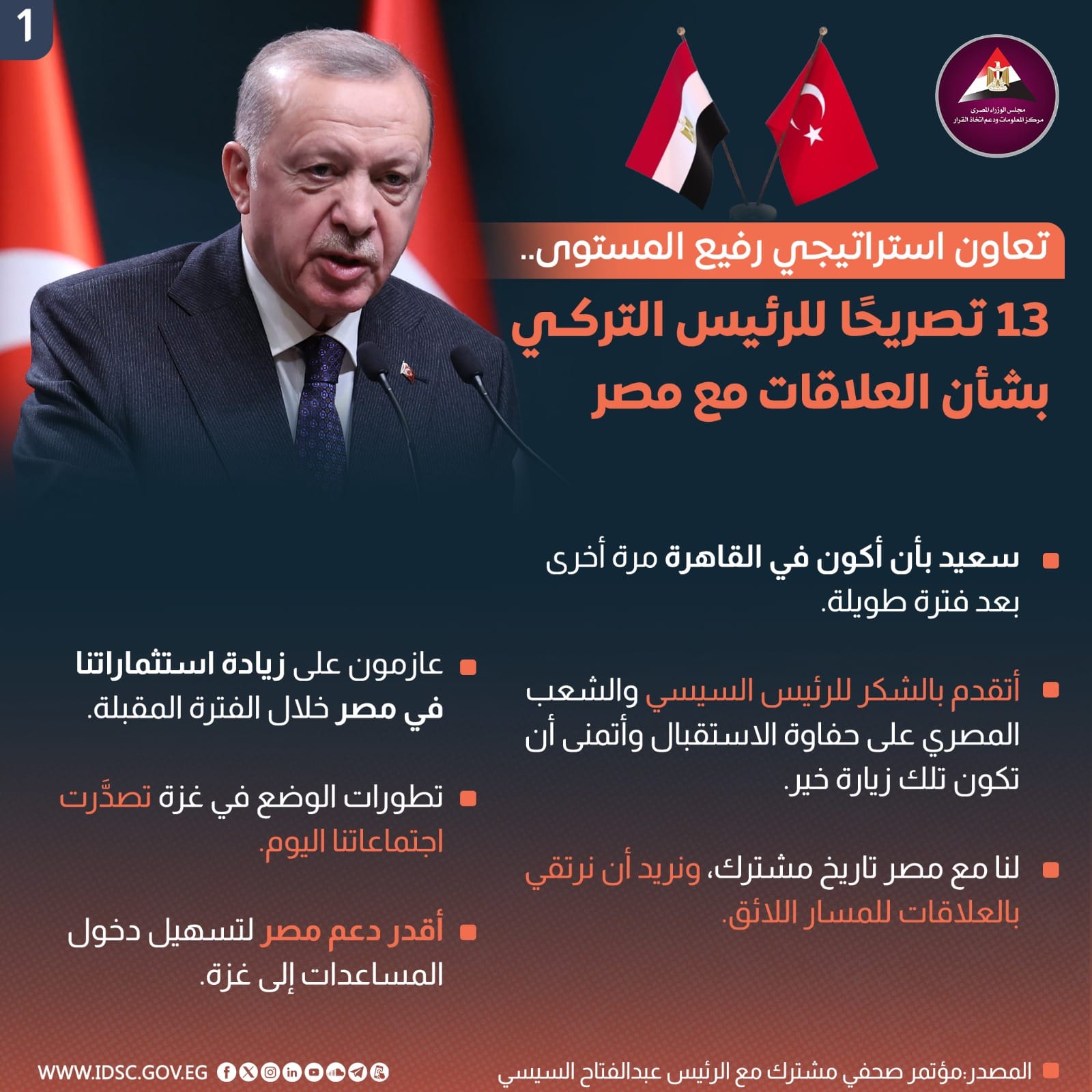 نشرت الصفحة الرسمية لمركز المعلومات ودعم اتخاذ القرار بمجلس الوزراء على موقع التواصل الاجتماعي "فيسبوك" إنفوجراف جديدا تحت عنوان (تعاون استراتيجي رفيع المستوى..13 تصريحا للرئيس التركي بشأن العلاقات مع مصر)