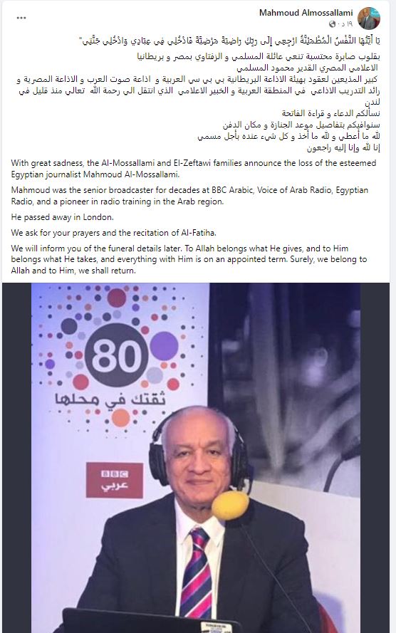 وأوضح أن الإعلامي محمود المسلمي هو كبير المذيعين لعقود بهيئة الإذاعة البريطانية بي بي سي العربية وإذاعة صوت العرب والإذاعة المصرية ورائد التدريب الإذاعي في المنطقة العربية والخبير الإعلامي الذي انتقل إلى رحمة الله تعالى منذ قليل في لندن".