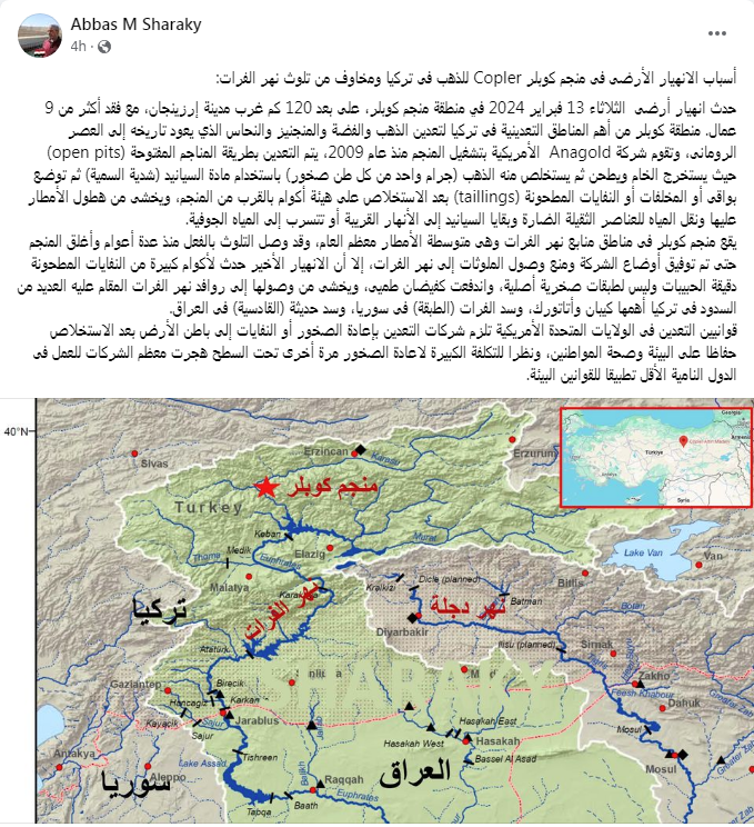 قال الدكتور عباس شراقي عن انهيار منجم كوبلر في تركيا: "أسباب الانهيار الأرضى فى منجم كوبلر Copler للذهب فى تركيا ومخاوف من تلوث نهر الفرات: حدث انهيار أرضى الثلاثاء 13 فبراير 2024 في منطقة منجم كوبلر، على بعد 120 كم غرب مدينة إرزينجان، مع فقد أكثر من 9 عمال."