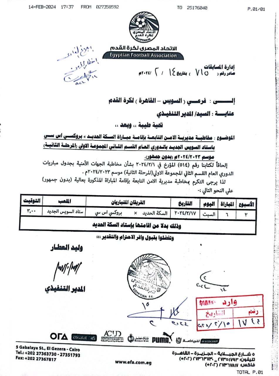 دوري المحترفين، خاطب اتحاد الكرة، نادي السكة الحديد لمخاطبة الأمن للموافقة علي نقل مباراته المقبلة باستاد السكة الحديد لملعب السويس الجديد يوم السبت المقبل.