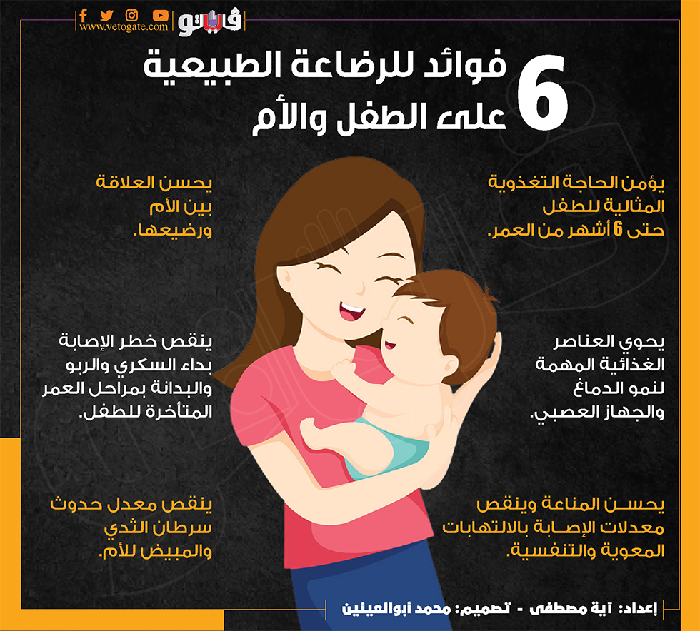 6 فوائد للرضاعة الطبيعية على الطفل والأم (إنفوجراف) الجمعة 16/فبراير/2024 - 04:00 م 2/16/2024 4:00:59 PM الرضاعة الطبيعية، فيتو آية مصطفى شارك طباعة 18 حجم الخط َ شارك طباعة الرضاعة الطبيعية الاصابة بالالتهابات الجهاز العصبى العناصر الغذائية المهمة سرطان الثدي