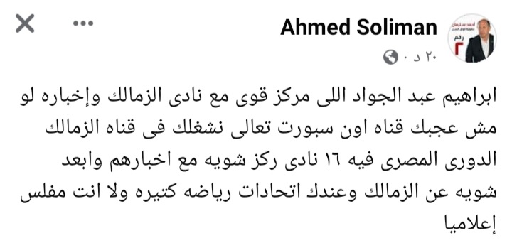 وانتقد أحمد سليمان، إبراهيم عبد الجواد عبر حسابه.