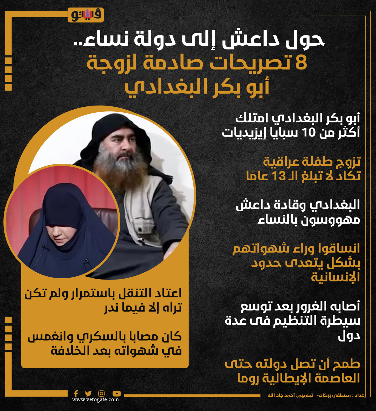 حوَّل داعش إلى دولة نساء.. 8 تصريحات صادمة لزوجة أبو بكر البغدادي (إنفوجراف) الخميس 15/فبراير/2024 - 09:00 م 2/15/2024 9:00:17 PM أبو بكر البغدادي، فيتو مصطفى بركات شارك طباعة 18 حجم الخط شارك طباعة زوجة أبو بكر البغدادي سبايا إيزيديات أبو بكر البغدادى داعش البغدادي