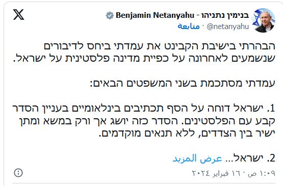 وفي حسابه على منصة "إكس"، كتب نتنياهو: "لقد أوضحت في جلسة مجلس الوزراء موقفي من الحديث الأخير عن فرض دولة فلسطينية على إسرائيل"، مضيفًا: "موقفي يتلخص في الجملتين التاليتين":