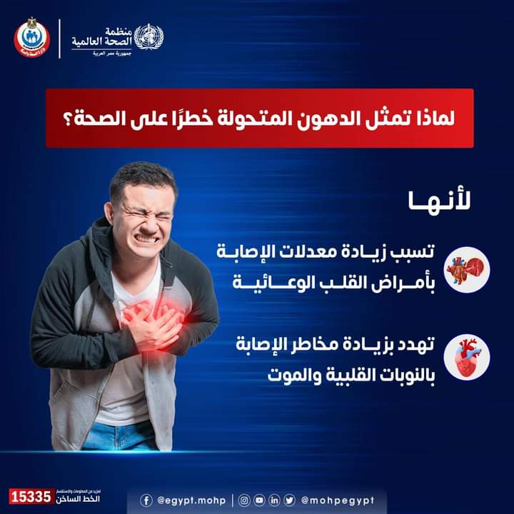 حذرت وزارة الصحة من الإفراط في تناول الدهون المتحولة لخطورتها على الصحة حيث تسبب الدهون المتحولة زيادة الإصابة بأمراض القلب، كما تهدد بزيادة النوبات القلبية والموت.