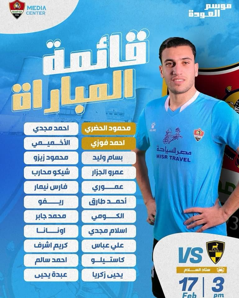 قائمة غزل المحلة لمواجهة وادي دجلة