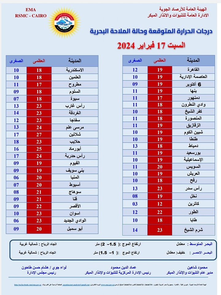 ونشرت هيئة الأرصاد الجوية بيانًا بدرجات الحرارة المتوقعة اليوم السبت كالتالي: