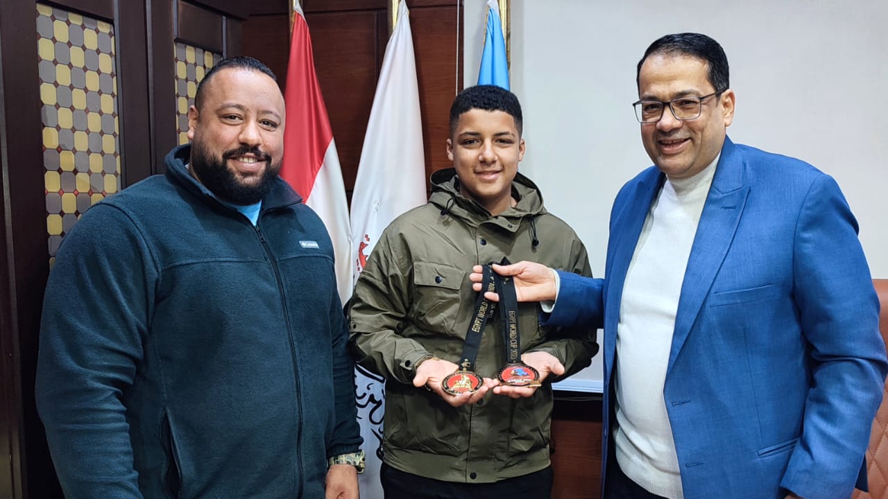 جدير بالذكر أن البطل حامد خلاف، ابن قرية ميت حبيش بمركز طنطا، مدرب الطالب قد حصل على الميدالية الذهبية، وأعلي رقم في بطوله كأس العالم للعام الثاني علي التوالي، في البطولة التي تقام حاليًا في شرم الشيخ.