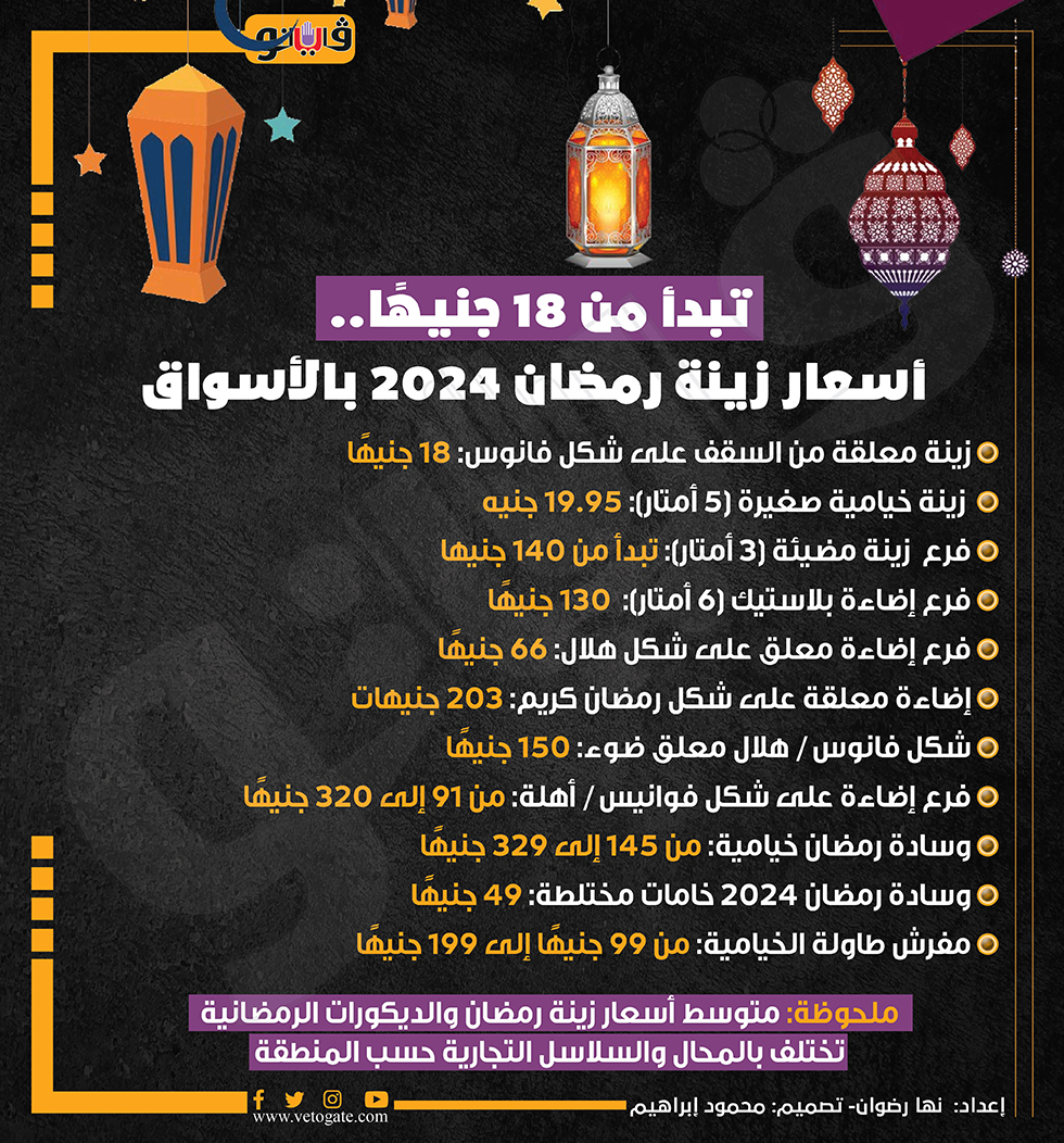 تبدأ من 18 جنيهًا.. أسعار زينة رمضان 2024 بالأسواق (انفوجراف) السبت 17/فبراير/2024 - 03:56 م 2/17/2024 3:56:43 PM أسعار زينة رمضان 2024، فيتو نها رضوان شارك طباعة 18 حجم الخط شارك طباعة سعر زينة رمضان 2024 أسعار زينة رمضان 2024 زينة رمضان 2024 رمضان 2024 مفرش خيامية رمضان 2024 فرع نور رمضان 2024 أشكال زينة رمضان 2024