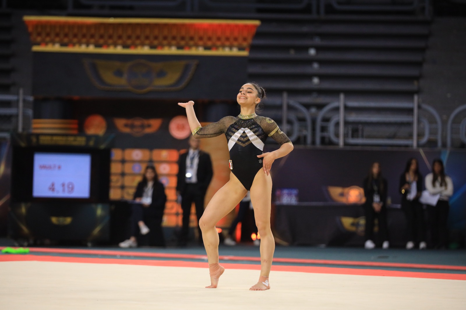وفي منافسات جهاز الحركات الأرضية، تأهلت جنى محمود لاعبة منتخب مصر إلى الدور النهائي بعد أن قدمت أداء مميز في مرحلة التصفيات.