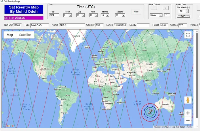 ونشر المركز خارطة تبين موقع السقوط المتوقع حاليا وتبين الخطوط الخضراء والحمراء الأماكن التي سيمر فوقها القمر الصناعي خلال عشر ساعات قبل وبعد موعد السقوط المتوقع.