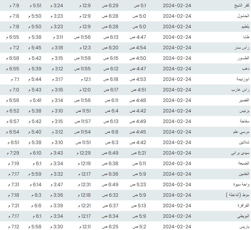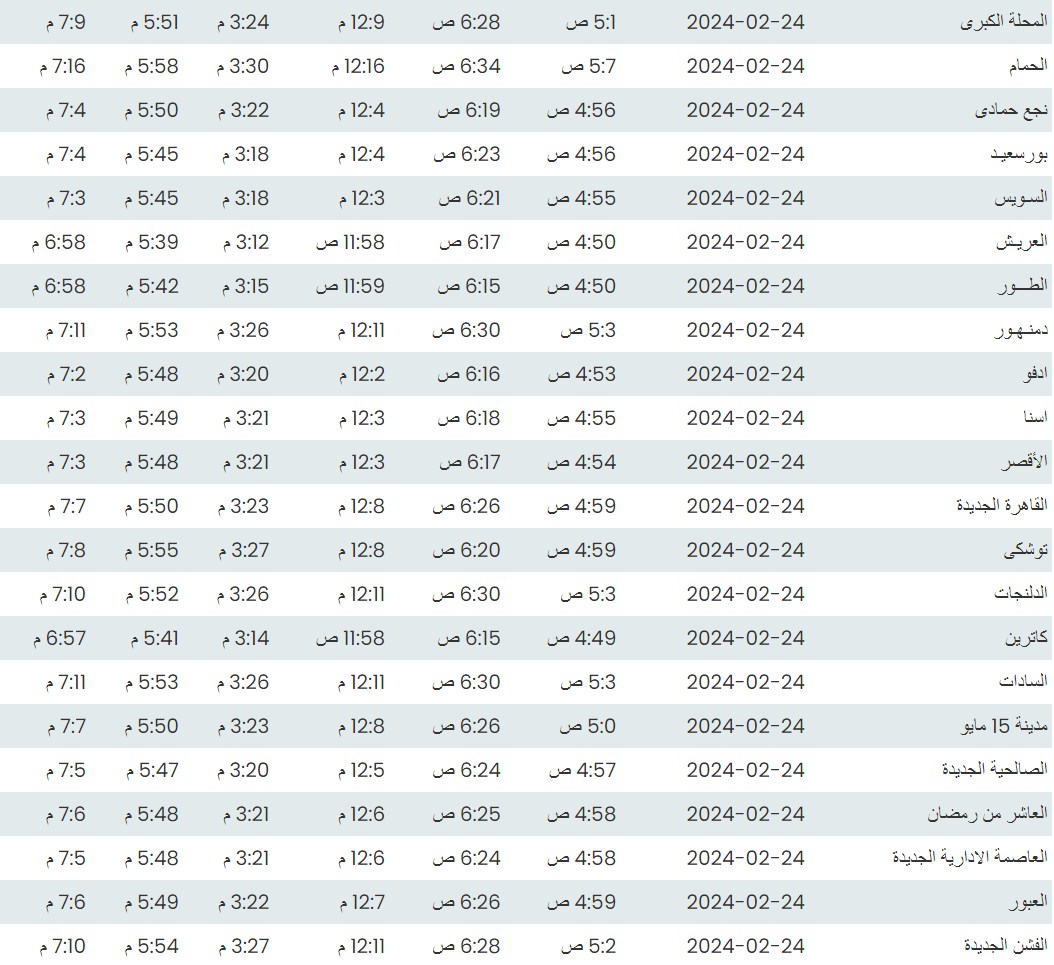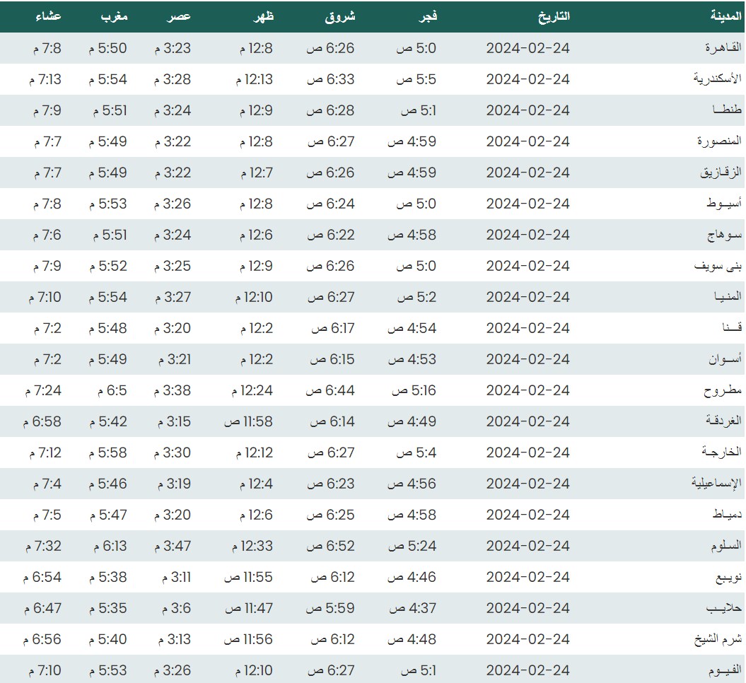 وفيما يلي مواقيت الصلاة، لعدد من مدن ومحافظات الجمهورية من واقع بيانات الهيئة العامة للمساحة