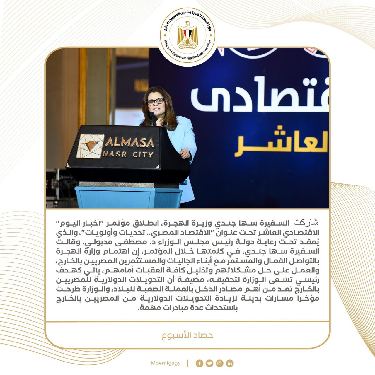 9- شاركت السفيرة سها جندي، في فعاليات مؤتمر "أخبار اليوم" الاقتصادي العاشر تحت عنوان "الاقتصاد المصري.. تحديات وأولويات"، والذي يُعقد تحت رعاية دولة رئيس مجلس الوزراء د. مصطفى مدبولي.