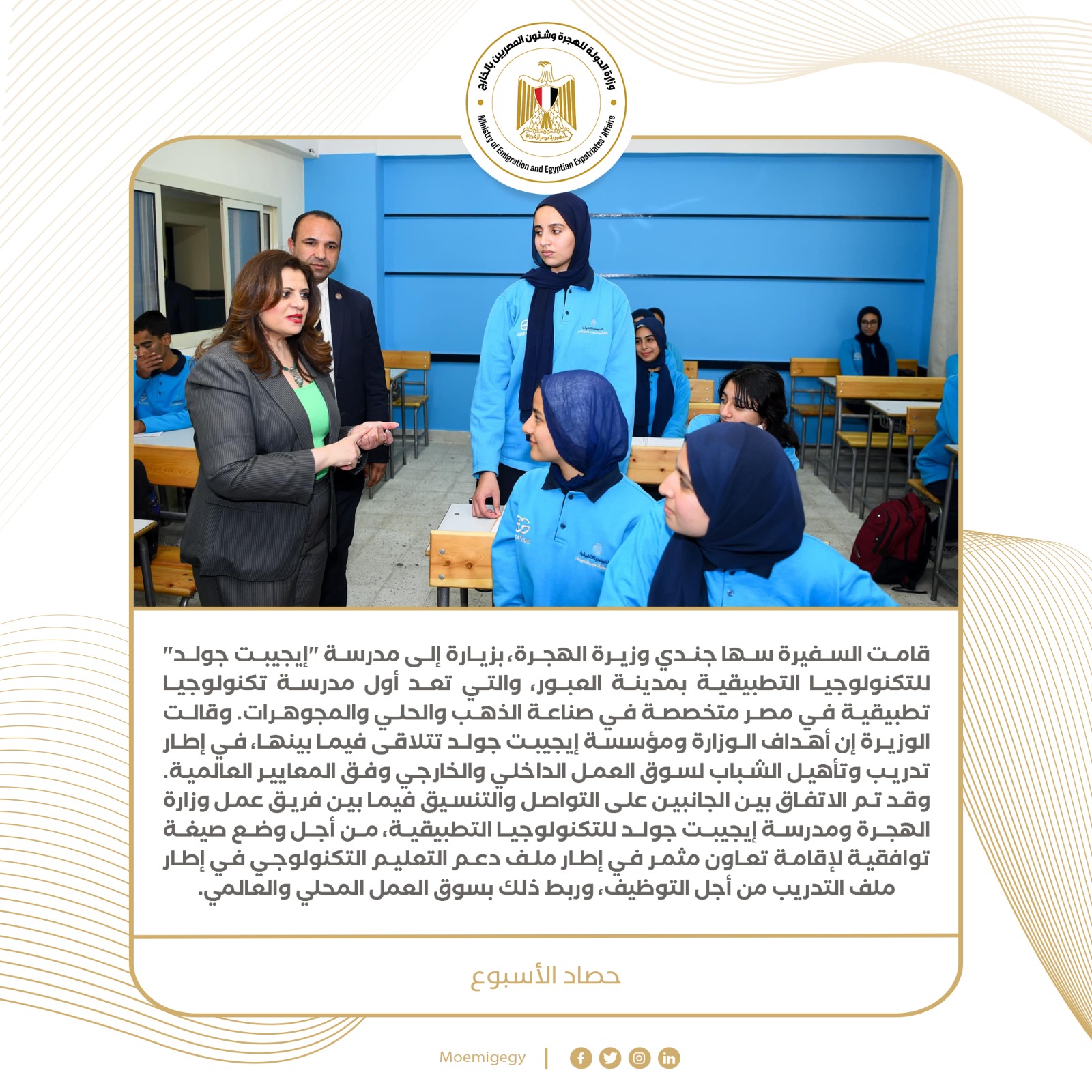 6- أجرت السفيرة سها جندي، زيارة إلى مدرسة "إيجيبت جولد" للتكنولوجيا التطبيقية بمدينة العبور، والتي تعد أول مدرسة تكنولوجيا تطبيقية في مصر متخصصة في صناعة الذهب والحلي والمجوهرات. وقالت الوزيرة إن أهداف الوزارة ومؤسسة إيجيبت جولد تتلاقى فيما بينها، في إطار تدريب وتأهيل الشباب لسوق العمل الداخلي والخارجي وفق المعايير العالمية. وقد تم الاتفاق بين الجانبين على التواصل والتنسيق فيما بين فريق عمل وزارة الهجرة ومدرسة إيجيبت جولد للتكنولوجيا التطبيقية، من أجل وضع صيغة توافقية لإقامة تعاون مثمر في إطار ملف دعم التعليم التكنولوجي في إطار ملف التدريب من أجل التوظيف، وربط ذلك بسوق العمل المحلي والعالمي.
