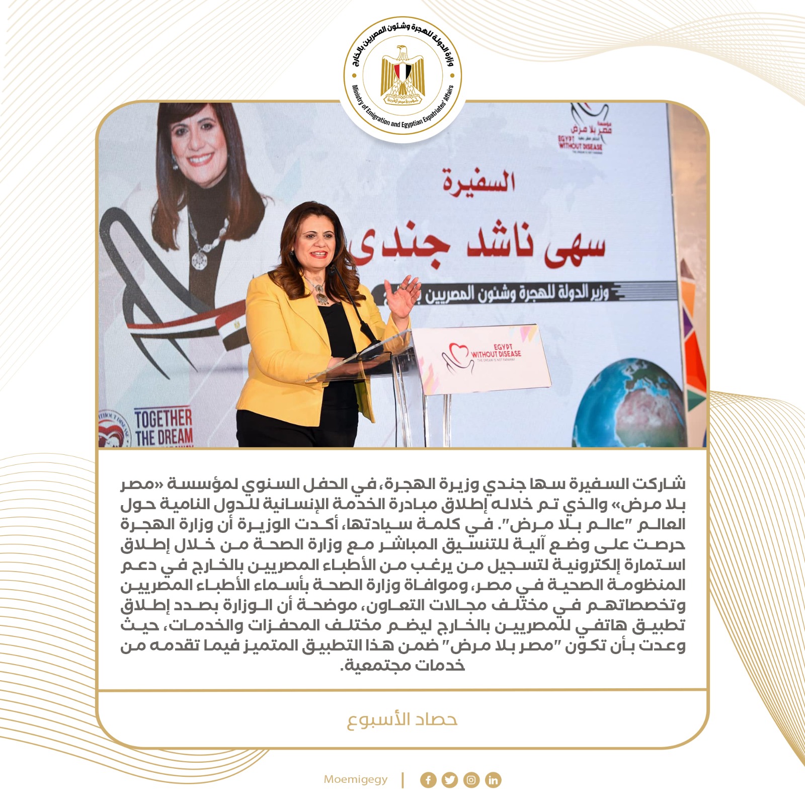3- شاركت السفيرة سها جندي، في الحفل السنوي لمؤسسة «مصر بلا مرض» والذي تم خلاله إطلاق مبادرة الخدمة الإنسانية للدول النامية حول العالم "عالم بلا مرض".