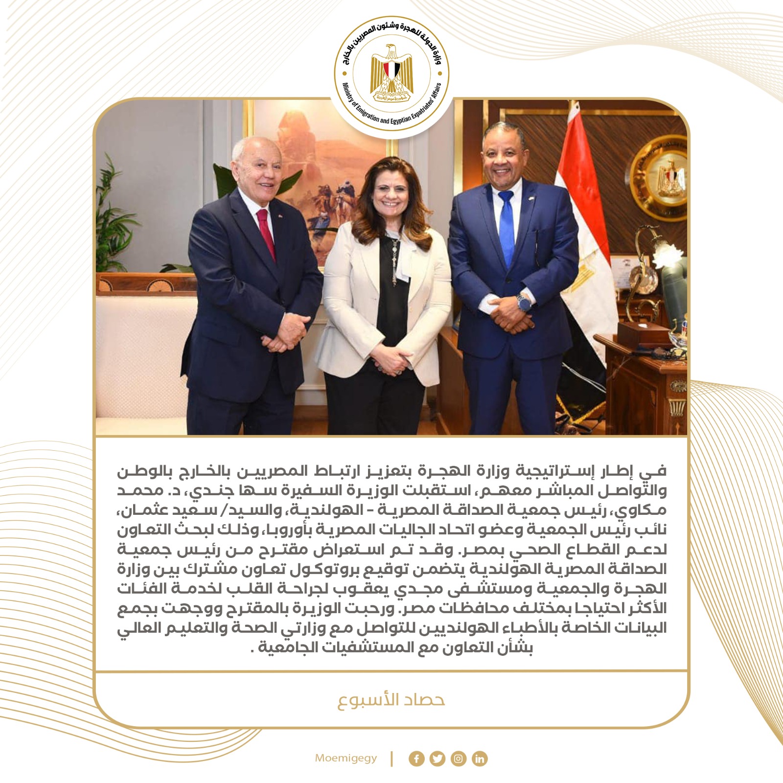 1- في إطار إستراتيجية وزارة الهجرة بتعزيز ارتباط المصريين بالخارج بالوطن والتواصل المباشر معهم، استقبلت الوزيرة سها جندي، د. محمد مكاوي، رئيس جمعية الصداقة المصرية – الهولندية، وسعيد عثمان، نائب رئيس الجمعية وعضو اتحاد الجاليات المصرية بأوروبا، وذلك لبحث التعاون لدعم القطاع الصحي بمصر. وقد تم استعراض مقترح من رئيس جمعية الصداقة المصرية الهولندية يتضمن توقيع بروتوكول تعاون مشترك بين وزارة الهجرة والجمعية ومستشفى مجدي يعقوب لجراحة القلب لخدمة الفئات الأكثر احتياجا بمختلف محافظات مصر.