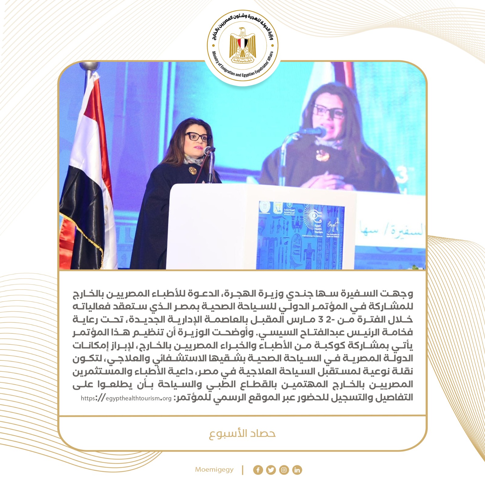 8- وجهت وزيرة الهجرة، الدعوة للأطباء المصريين بالخارج للمشاركة في المؤتمر الدولي للسياحة الصحية بمصر الذي ستعقد فعالياته خلال الفترة من 2- 3 مارس المقبل بالعاصمة الإدارية الجديدة، تحت رعاية فخامة الرئيس عبدالفتاح السيسي. وأوضحت الوزيرة أن تنظيم هذا المؤتمر يأتي بمشاركة كوكبة من الأطباء والخبراء المصريين بالخارج، لإبراز إمكانات الدولة المصرية في السياحة الصحية بشقيها الاستشفائي والعلاجي، لتكون نقلة نوعية لمستقبل السياحة العلاجية في مصر، داعية الأطباء والمستثمرين المصريين بالخارج المهتمين بالقطاع الطبي والسياحة بأن يطلعوا على التفاصيل والتسجيل للحضور عبر الموقع الرسمي للمؤتمر: https://egypthealthtourism.org