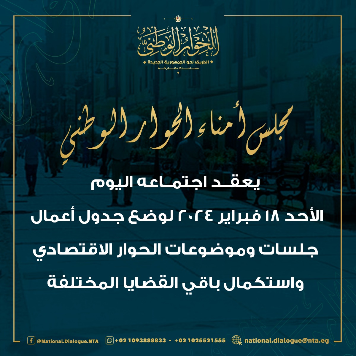 يستكمل مجلس أمناء الحوار الوطني اليوم اجتماعاته لبحث جدول أعمال وجلسات موضوعات الحوار الاقتصادي وباقي جلسات الموضوعات المختلفة.
