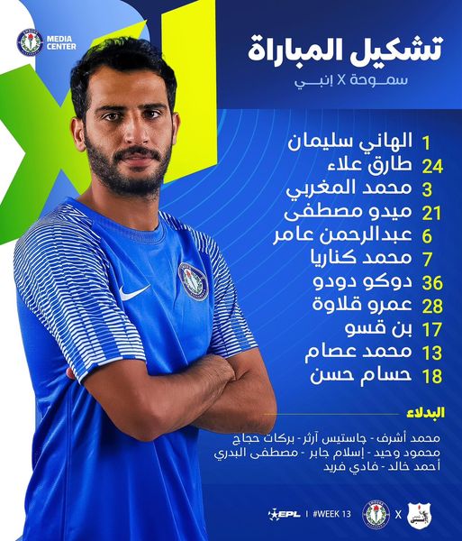 الدوري المصري، اعلن احمد سامي المدير الفني لفريق سموحة تشكيلة فريقه لمواجهة انبي اليوم الأحد على استاد بتروسبورت في إطار الجولة 13 من بطولة الدوري المصري الممتاز.