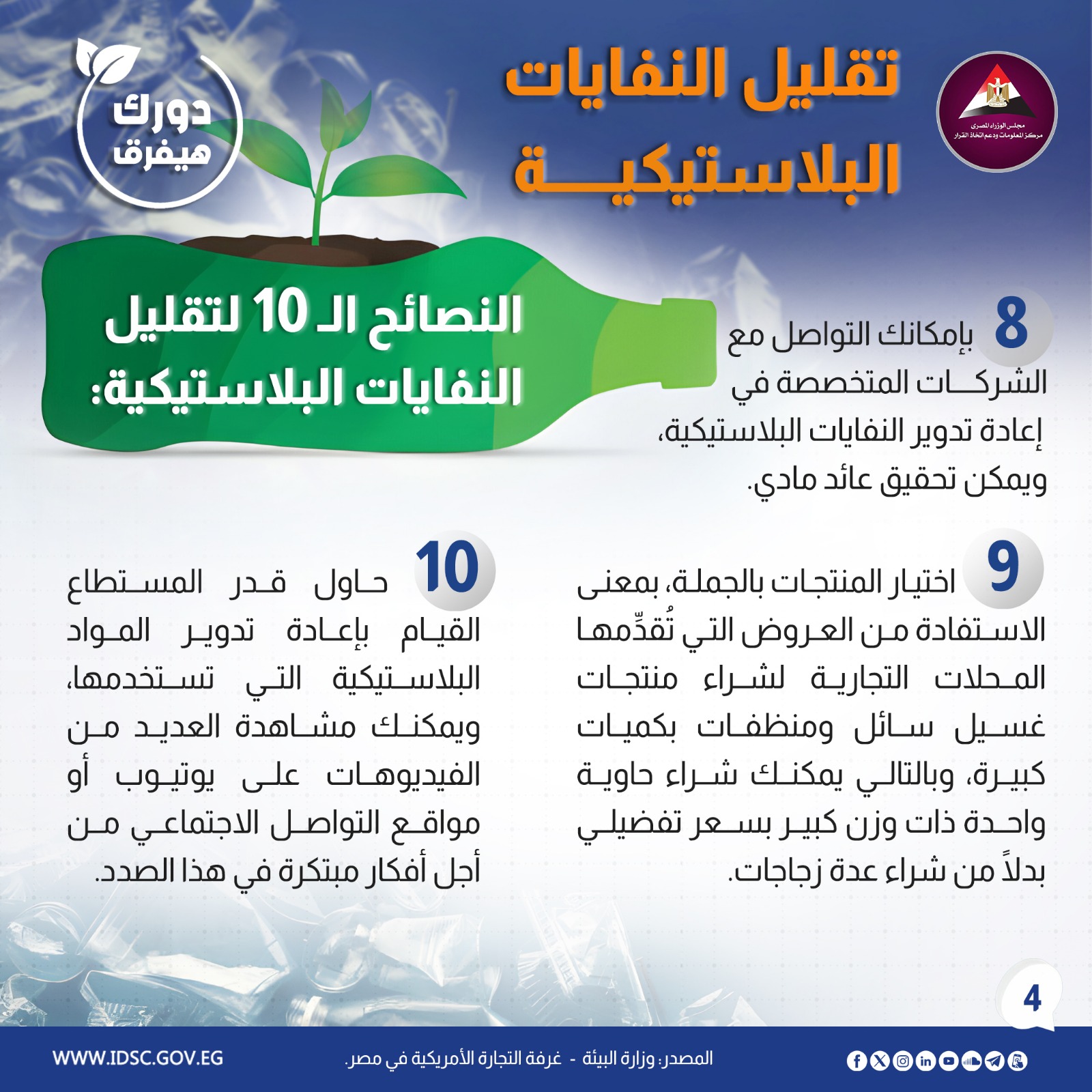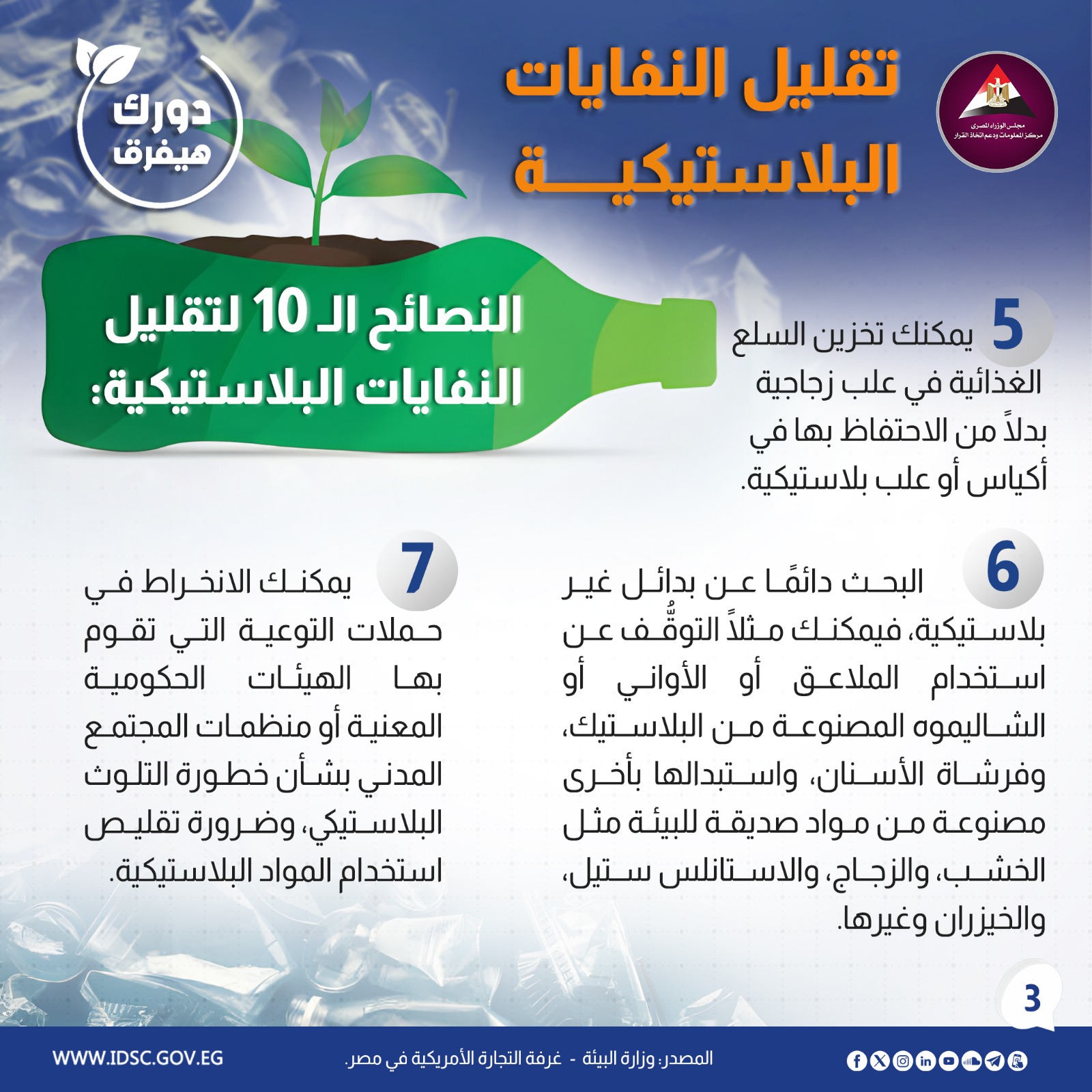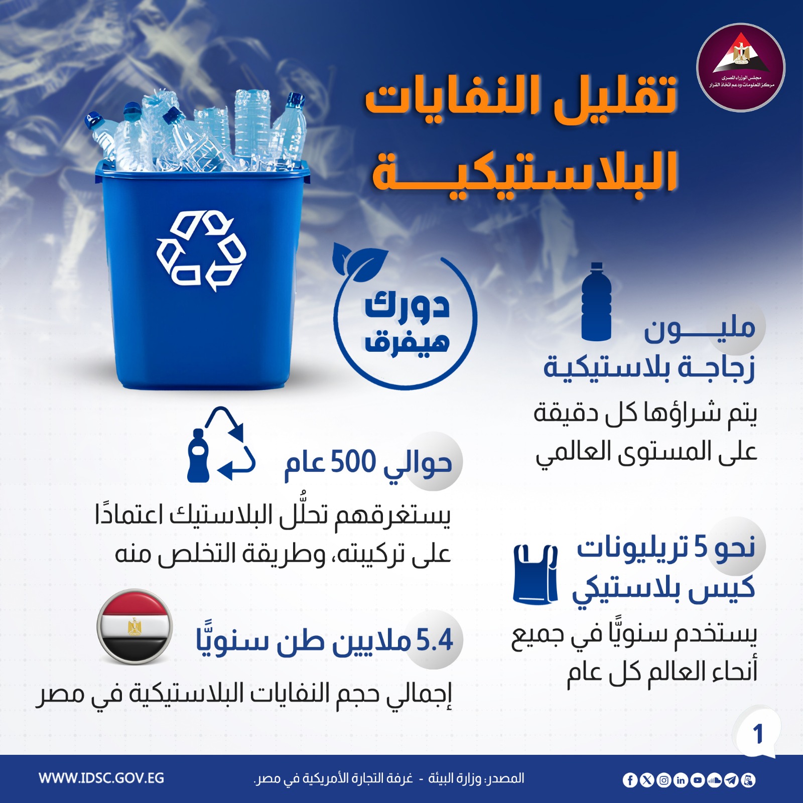 نشرت الصفحة الرسمية لمركز المعلومات ودعم اتخاذ القرار بمجلس الوزراء على موقع التواصل الاجتماعي "فيسبوك" إنفوجراف جديدا تحت عنوان (دورك هيفرق في كسر الحلقة المفرغة من التلوث البلاستيكي).