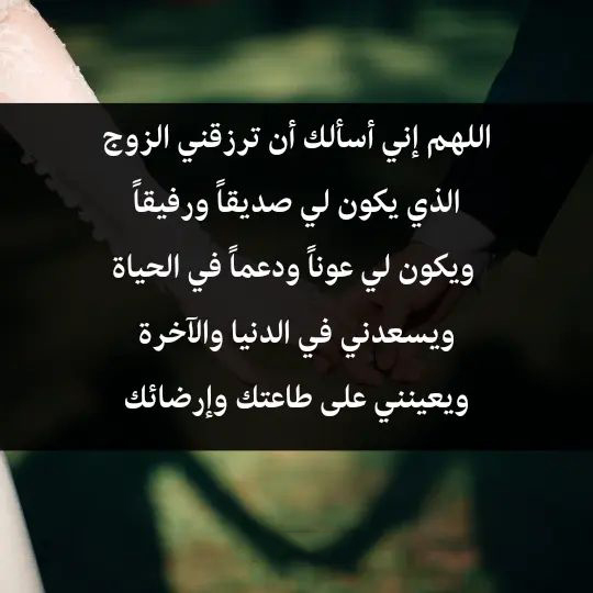 - اللهم ارزقني زوجًا تقرّ به عيني وتقرّ بي عينه. اللهمّ إني أعوذ بك من تأخّر الزواج وبطئه، وأسألك أن ترزقني خيرًا ممّا استحق.