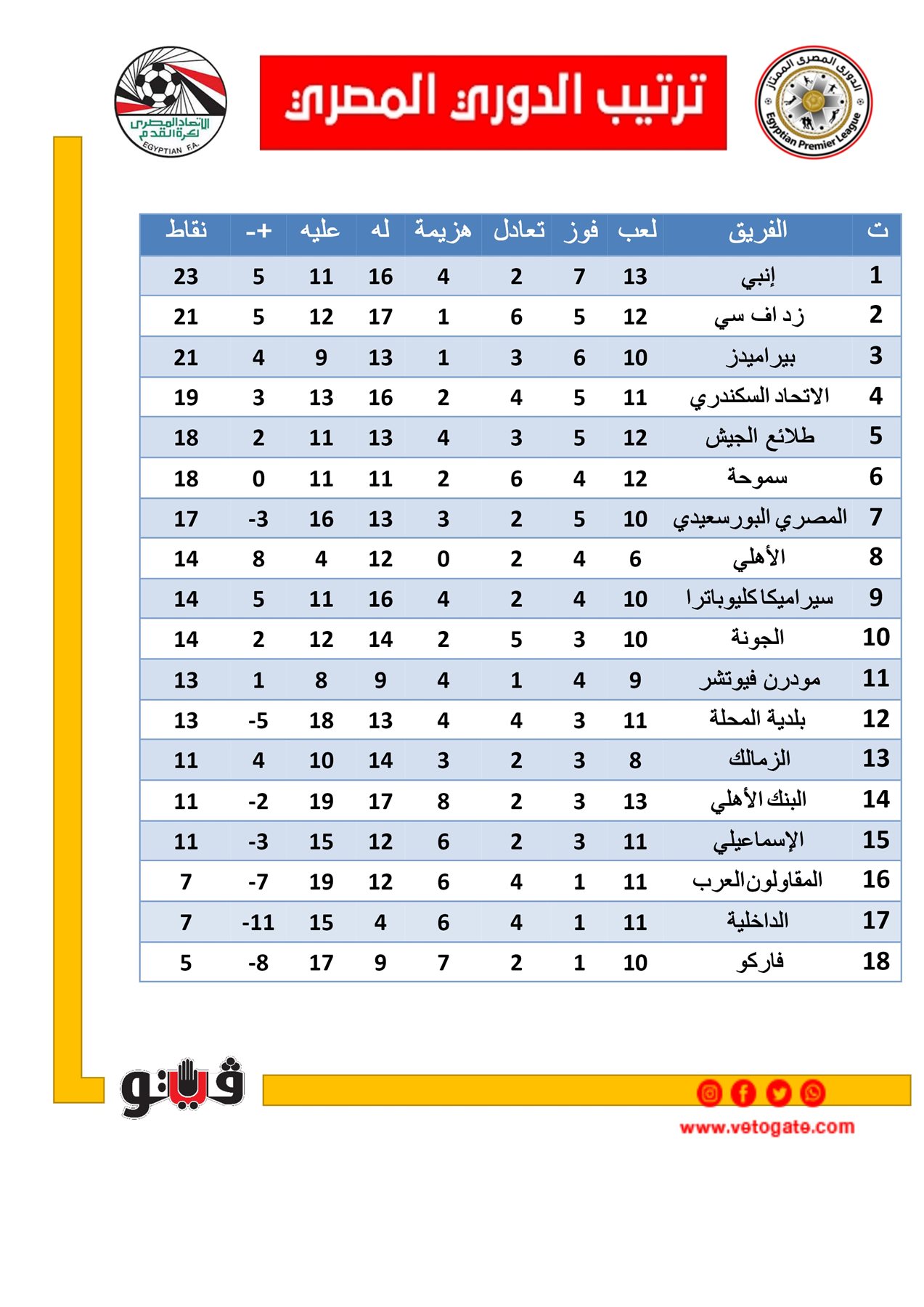 ترتيب الدوري المصري، يتصدر إنبي جدول ترتيب الدوري المصري الممتاز برصيد 23 نقطة قبل انطلاق مباراتي اليوم في الجولة الـ 13.