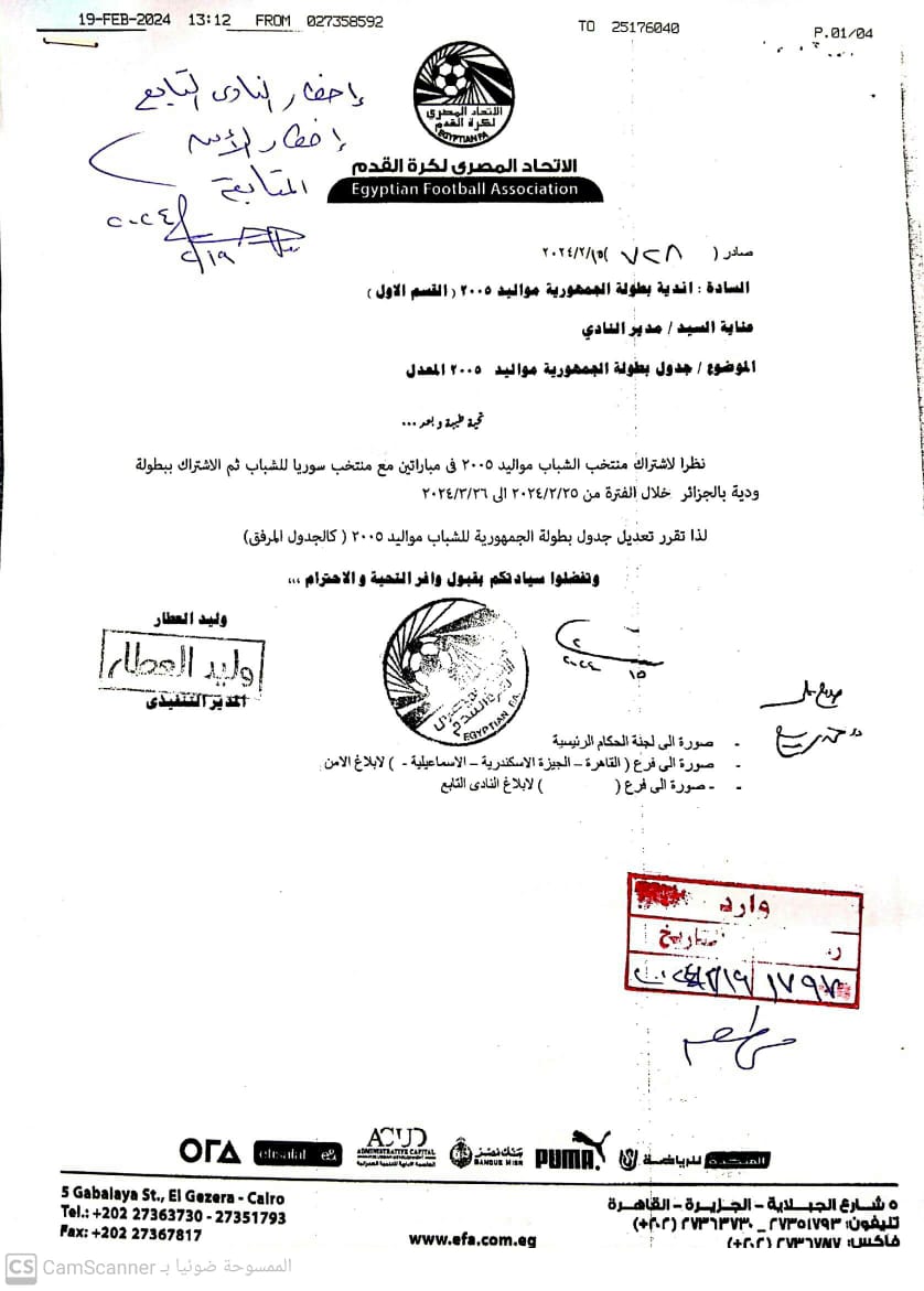 أعلن اتحاد الكرة، تعديل مواعيد مباريات دوري الجمهورية للناشئين 2005 بسبب مشاركة منتخب الشباب في مباراتين مع منتخب سوريا بالاضافة للمشاركة في دورة ودية بالجزائر.