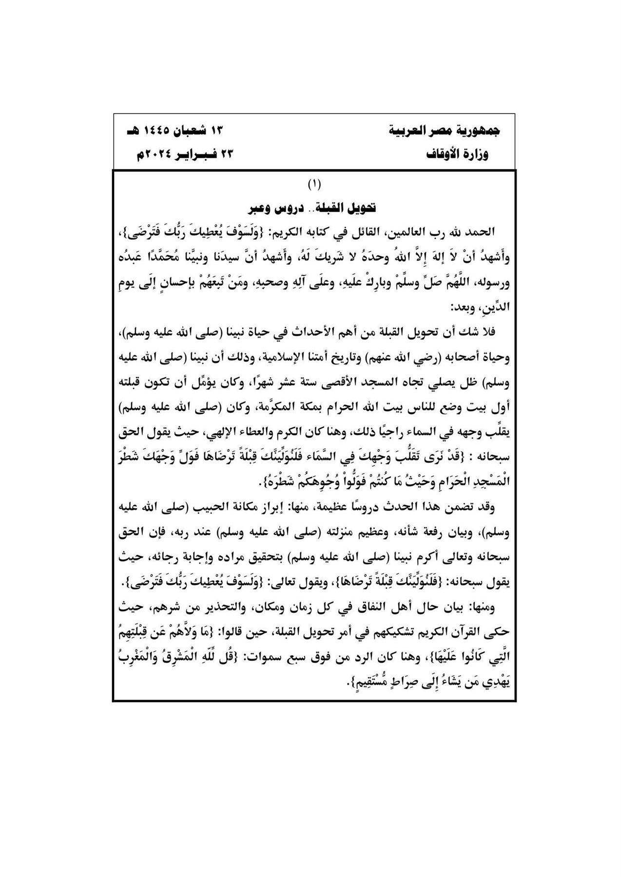 "تحويل القبلة.. دروس وعبر"، الأوقاف تنشر نص خطبة الجمعة المقبلة (صور)