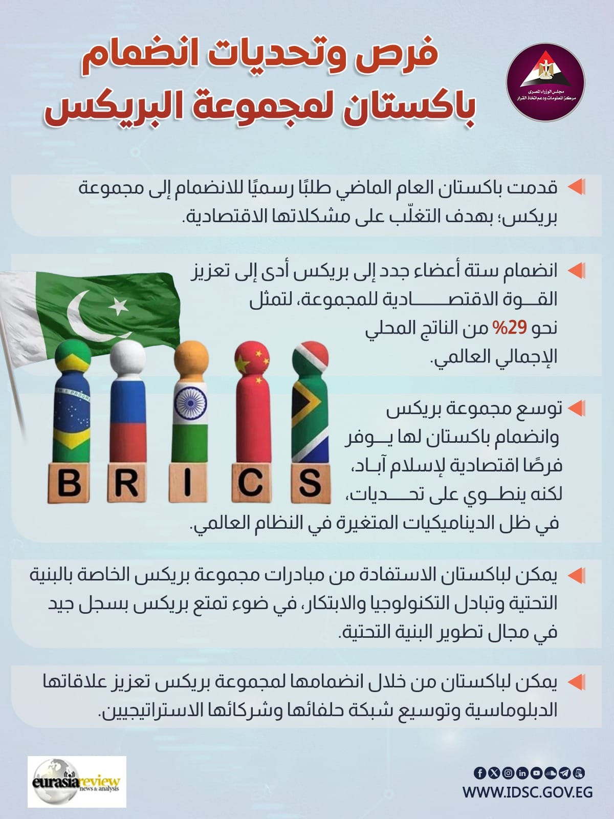 معلومات الوزراء يستعرض فرص وتحديات انضمام باكستان لمجموعة البريكس (إنفوجراف)