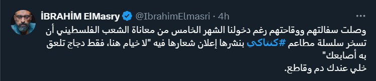 فجرت سلسلة مطاعم "كي إف سي" - كنتاكي" جدلًا كبيرًا على منصات التواصل بعد نشرها صورة على حساب رسمي لها، وُصفت بأنها مستفزة ضد الفلسطينيين وسكان قطاع غزة الذين يعانون من العدوان الإسرائيلي عليهم.