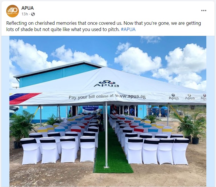 ورغم ذلك، بدا أن منشور "كنتاكي" قد أسيء فهمه، إذ غاب على بال المستخدمين خارج جزيرة أنتيجوا، أن البلاد تشهد موجة من السخرية على شركة توزيع الكهرباء والمياه - APUA، التي ناشدت متابعيها على منصات التواصل للعثور على خيمة ضخمة تابعة لها كانت فقدتها في الأيام الماضية وقالت إنها سرقت.