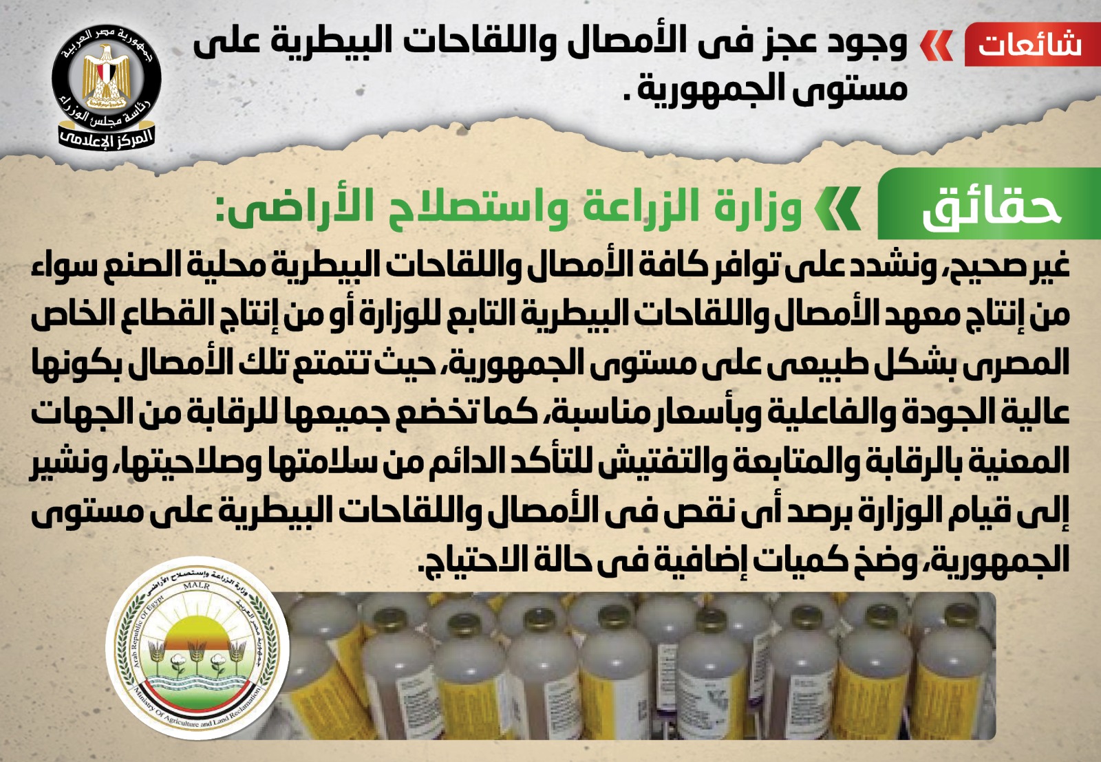 رصد المركز الإعلامي بمجلس الوزراء تداول بعض المواقع الإلكترونية وصفحات التواصل الاجتماعي أنباء بشأن وجود عجز في الأمصال واللقاحات البيطرية على مستوى الجمهورية، وقد قام المركز الإعلامي لمجلس الوزراء بالتواصل مع وزارة الزراعة واستصلاح الأراضي، والتي نفت تلك الأنباء.