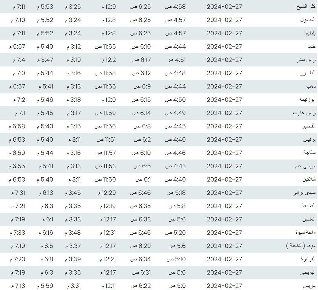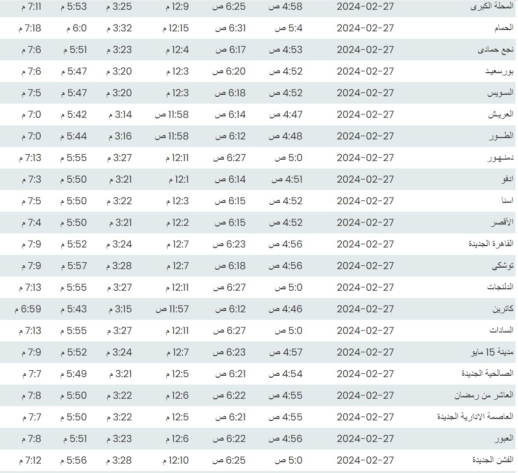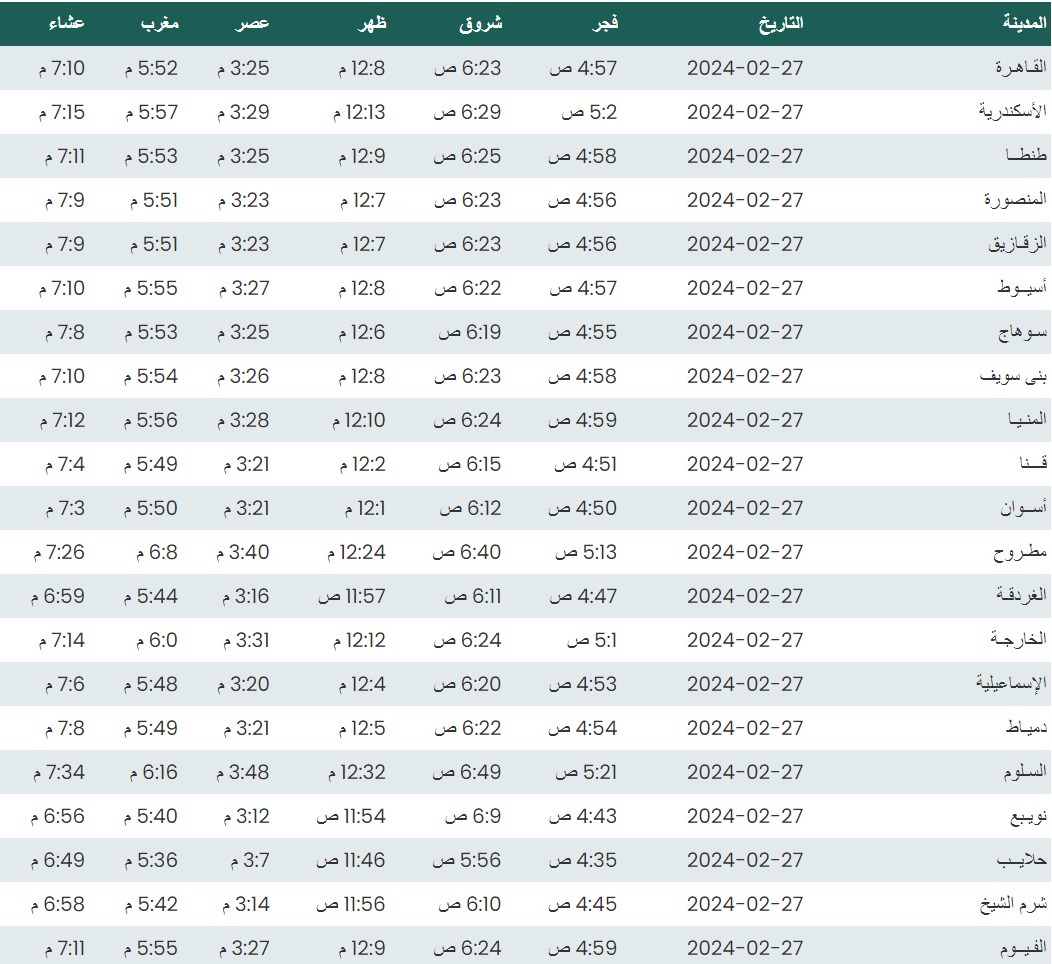 وفيما يلي مواقيت الصلاة، لعدد من مدن ومحافظات الجمهورية من واقع بيانات الهيئة العامة للمساحة