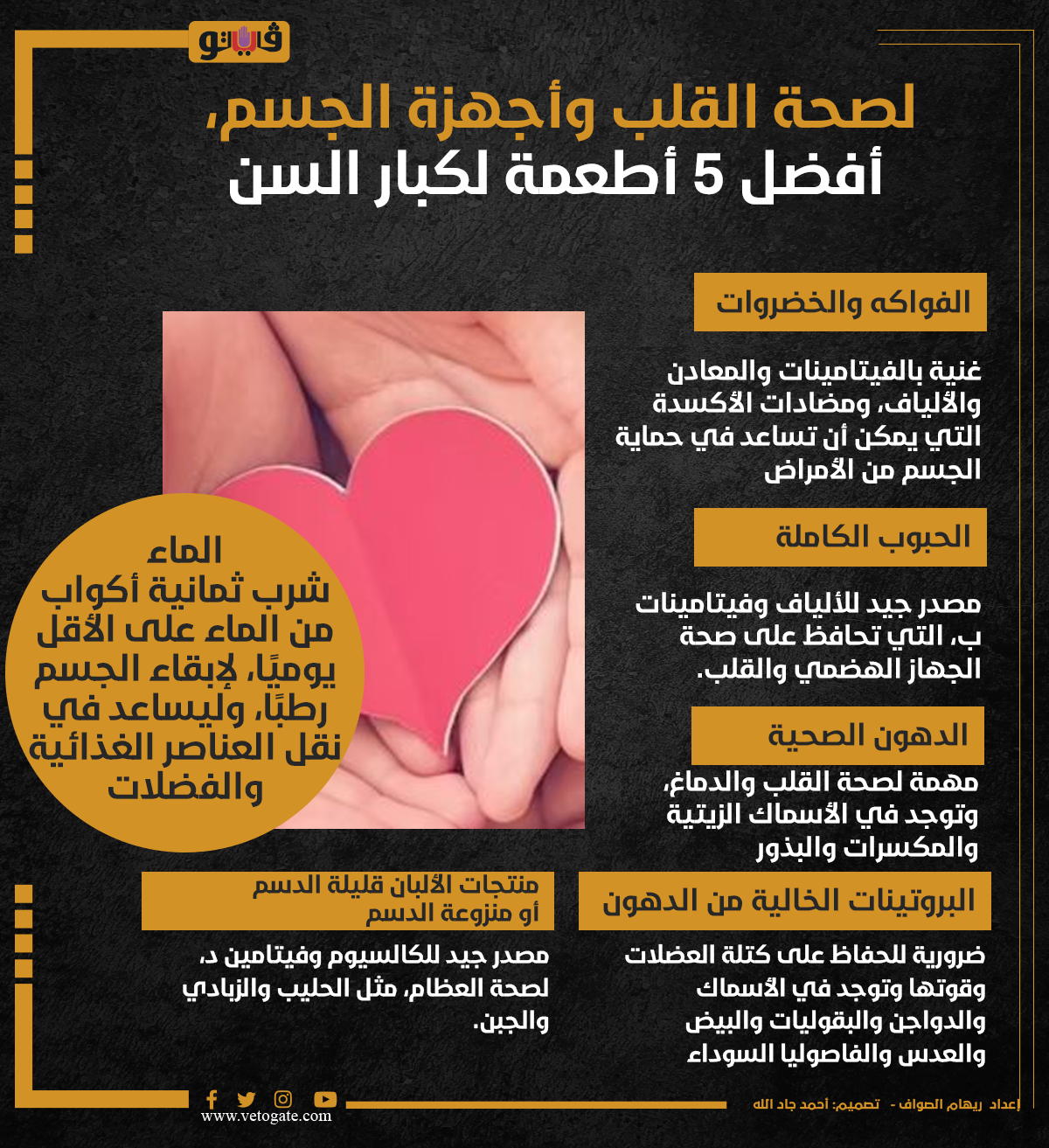 لصحة القلب وأجهزة الجسم، أفضل 5 أطعمة لكبار السن (إنفوجراف) الأربعاء 21/فبراير/2024 - 12:36 م 2/21/2024 12:36:44 PM تغذية كبار السن، فيتو ريهام الصواف شارك طباعة 18 حجم الخط شارك طباعة تغذية كبار السن تقوية مناعة كبار السن توصيات لتغذية كبار السن اطعمة لكبار السن أكلات لكبار السن