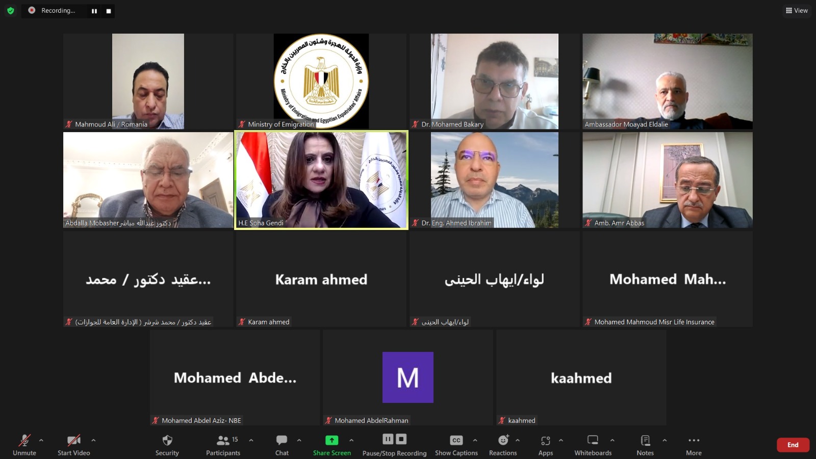 عقدت السفيرة سها جندي، وزيرة الدولة للهجرة وشؤون المصريين بالخارج، اجتماعا مع أعضاء ورموز الجاليات المصرية في رومانيا وبلغاريا، ضمن مبادرة «ساعة مع الوزيرة»، عبر الـ«فيديو كونفرانس»، بحضور السفير عمرو عباس، مساعد وزيرة الهجرة لشؤون الجاليات، دعاء قدري رئيس الإدارة المركزية لشئون مكتب الوزير، كريم حسن المستشار الإعلامي لوزارة الهجرة.