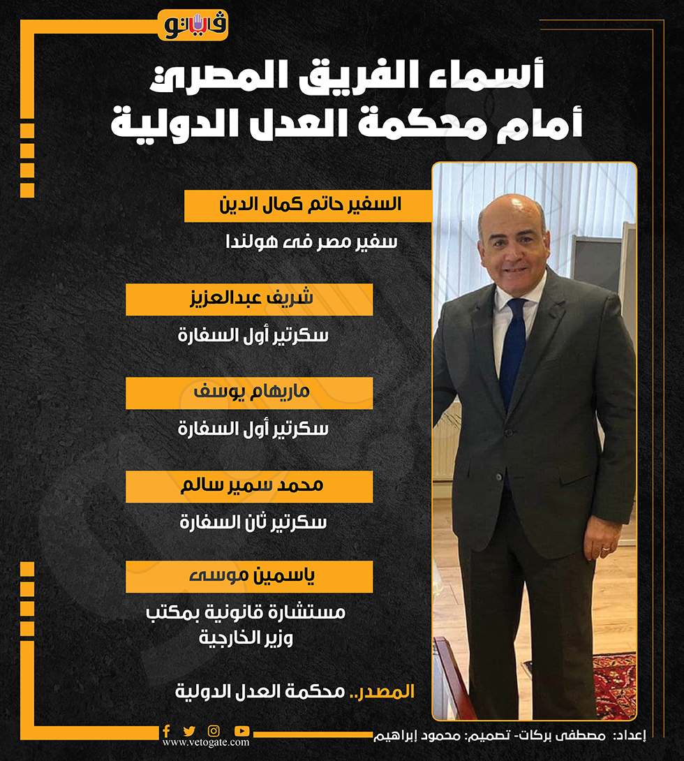 أسماء الفريق المصري أمام محكمة العدل الدولية (إنفوجراف) الثلاثاء 20/فبراير/2024 - 07:01 م 2/20/2024 7:01:35 PM محكمة العدل الدولية، فيتو مصطفى بركات شارك طباعة 18 حجم الخط شارك طباعة محكمة العدل الدولية السفير حاتم كمال الدين سفير مصر في هولندا العدل الدولية