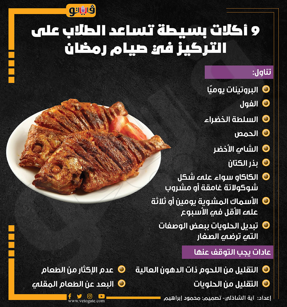 9 أكلات بسيطة تساعد الطلاب على التركيز في صيام رمضان (انفوجراف) السبت 02/مارس/2024 - 12:20 م 3/2/2024 12:20:19 PM أكلات تزيد من تركيز الطلاب، فيتو آية الشاذلي شارك طباعة 18 حجم الخط شارك طباعة رمضان الشاي الأخضر السلطة الخضراء الطعام المقلى الحلويات البروتين التركيز النظام الغذائي الكاكاو