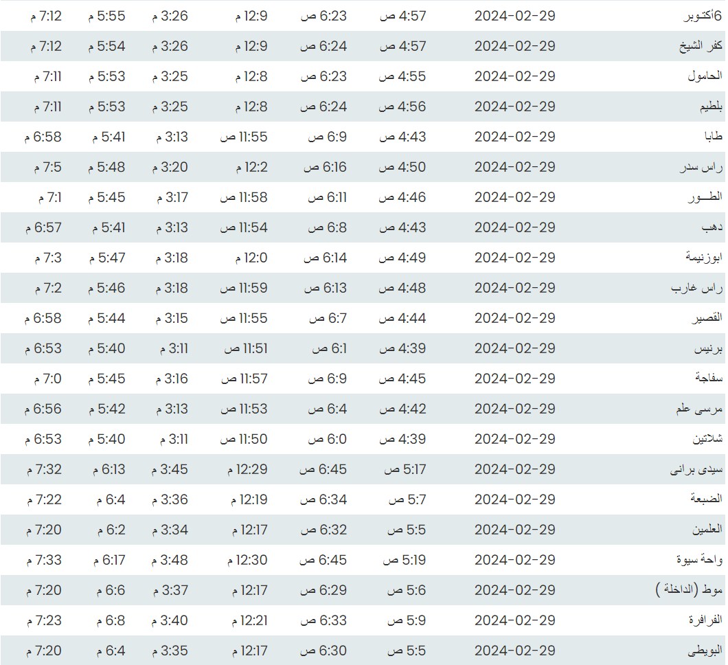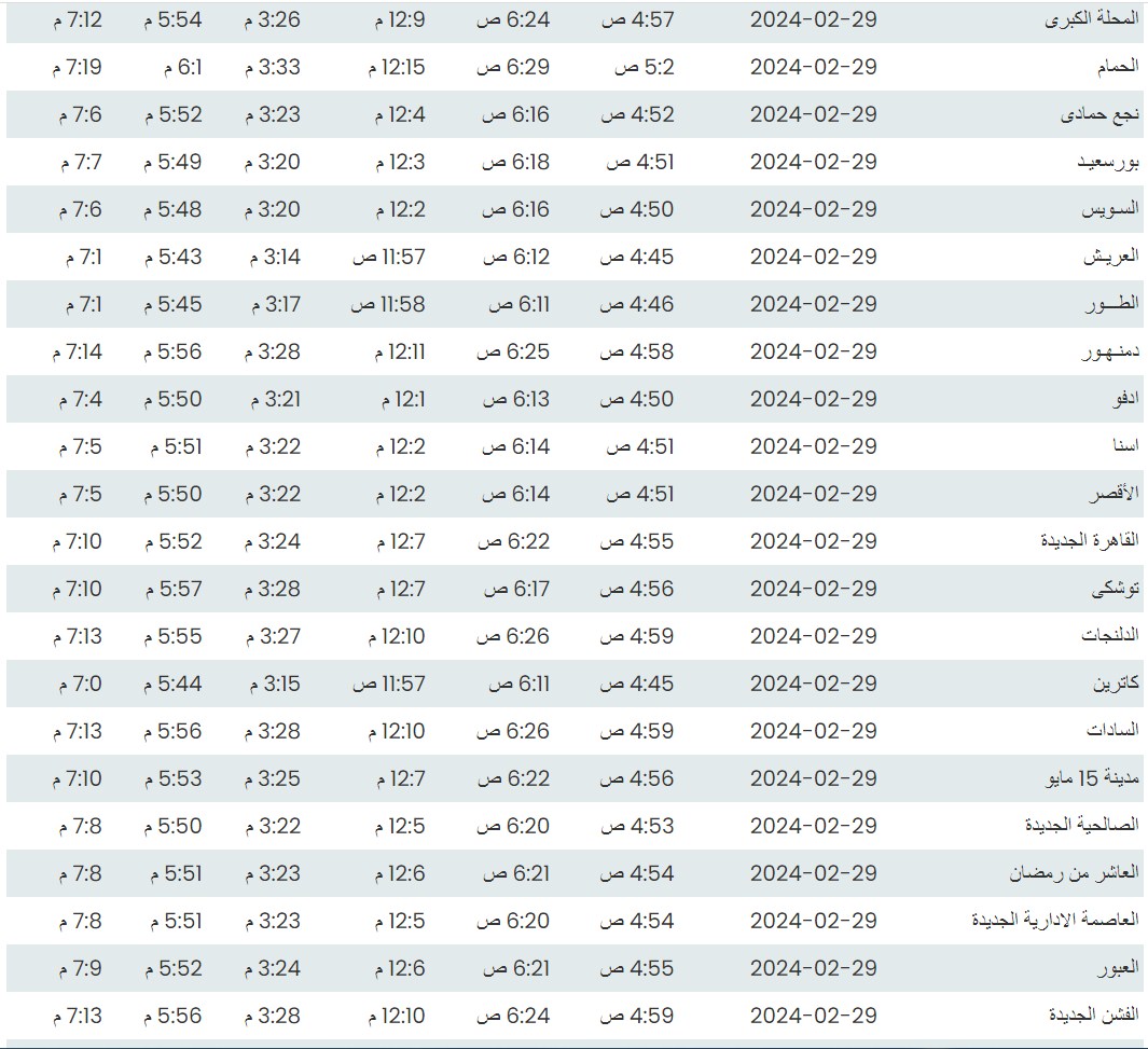 وفيما يلي مواقيت الصلاة، لعدد من مدن ومحافظات الجمهورية من واقع بيانات الهيئة العامة للمساحة