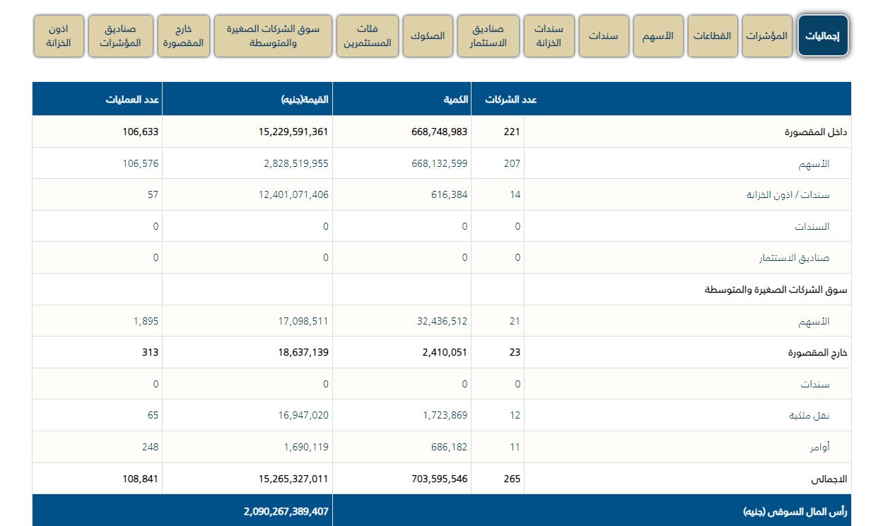 وارتفع مؤشر الشركات الصغيرة والمتوسطة "إيجي إكس 70 متساوي الأوزان" بنسبة 2.34 % عند مستوى 7.666.06 نقطة، وصعد مؤشر "إيجي إكس 100 متساوي الأوزان" بنسبة 1.89 % عند مستوى 10.647.38 نقطة.