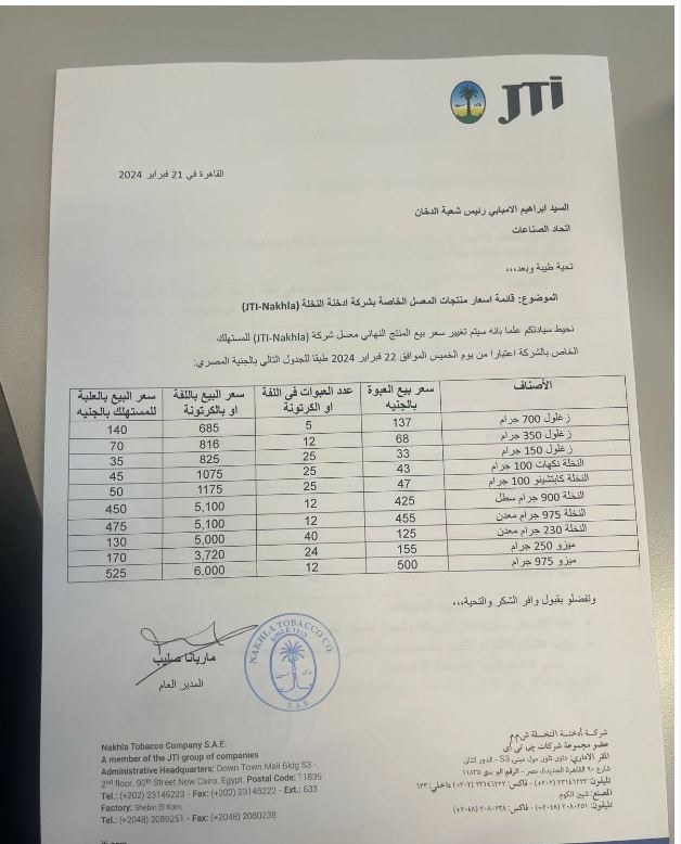 وذكرت الشركة في الخطاب المرسل إلى الشعبة العامة للدخان باتحاد الصناعات المصرية: نحيط سيادتكم علما بأنه سيتم تغيير سعر بيع المنتج النهائي لمعسل شركة أدخنة النخلة للمستهلك الخاص بالشركة، اعتبارًا من يوم الخميس الموافق 22 فبراير 2024 طبقا للجدول التالي بالجنيه المصري: