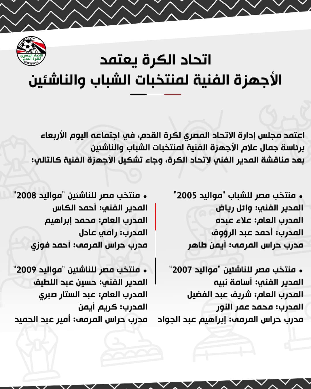 واعتمد مجلس إدارة الاتحاد المصري لكرة القدم، في اجتماعه اليوم الأربعاء برئاسة جمال علام، الأجهزة الفنية لمنتخبات الشباب والناشئين، بعد مناقشة المدير الفني لاتحاد الكرة، وجاء تشكيل الأجهزة الفنية كالتالي:
