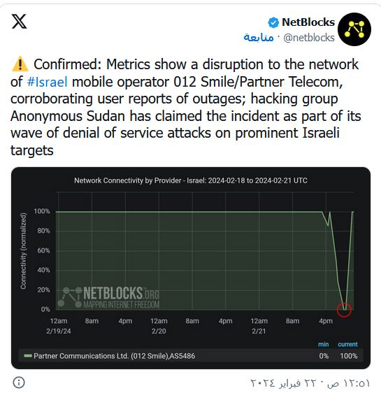 قراصنة أنونيموس السودان يستهدفون شبكة محمول إسرائيلية