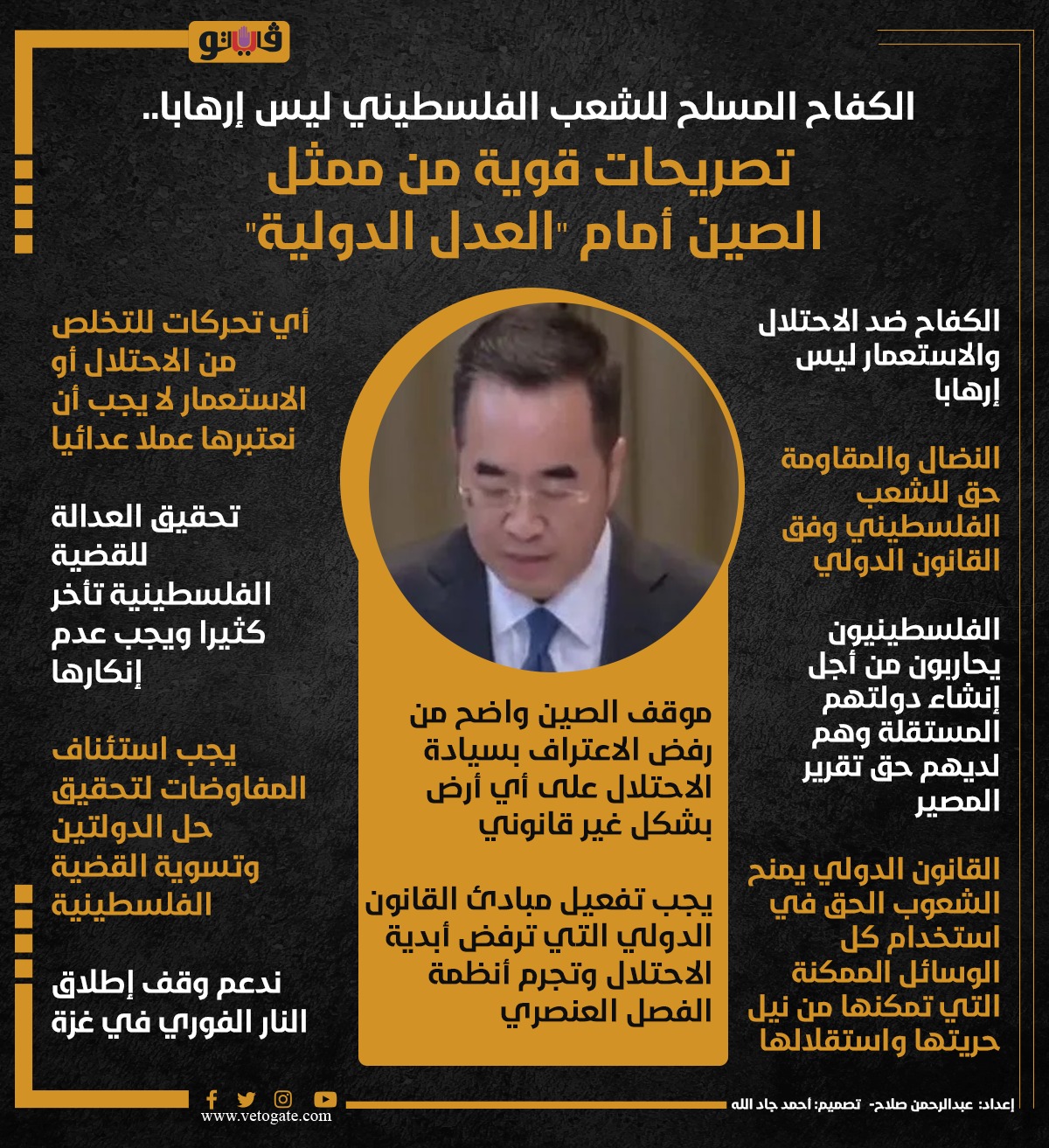 الكفاح المسلح للشعب الفلسطيني ليس إرهابا.. تصريحات قوية من ممثل الصين أمام "العدل الدولية" (انفوجراف) الخميس 22/فبراير/2024 - 12:36 م 2/22/2024 12:36:36 PM ممثل الصين أمام محكمة العدل الدولية، فيتو عبدالرحمن صلاح شارك طباعة 18 حجم الخط شارك طباعة محكمة العدل محكمة العدل الدولية طوفان الأقصى غزة قطاع غزة فلسطين ممثل الصين بمحكمة العدل