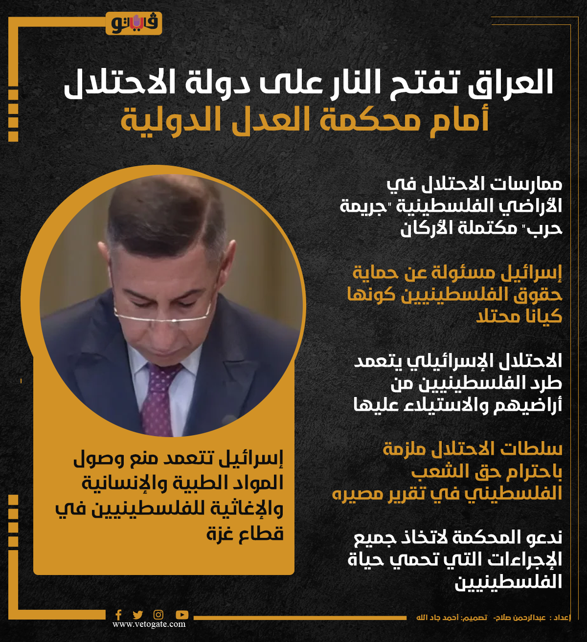 العراق تفتح النار على دولة الاحتلال أمام محكمة العدل الدولية (إنفوجراف) الخميس 22/فبراير/2024 - 02:31 م 2/22/2024 2:31:53 PM ممثل العراق بمحكمة العدل الدولية، فيتو عبدالرحمن صلاح شارك طباعة 18 حجم الخط شارك طباعة محكمة العدل الدولية محكمة العدل إسرائيل فلسطين غزة قطاع غزة العراق ممثل العراق بمحكمة العدل