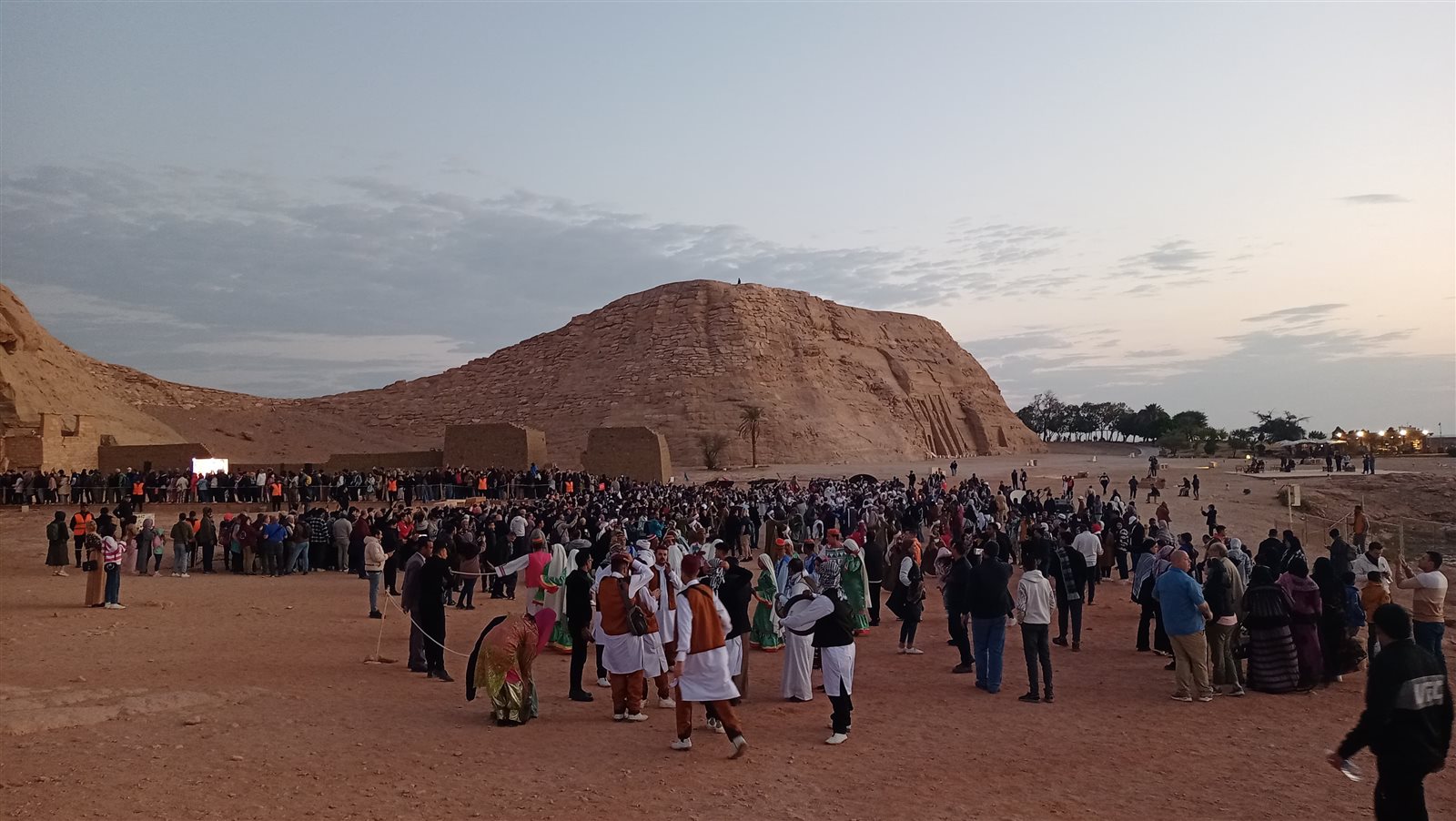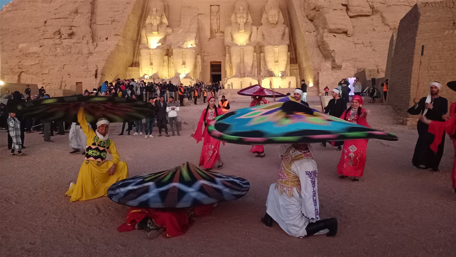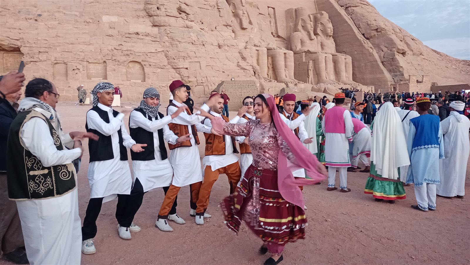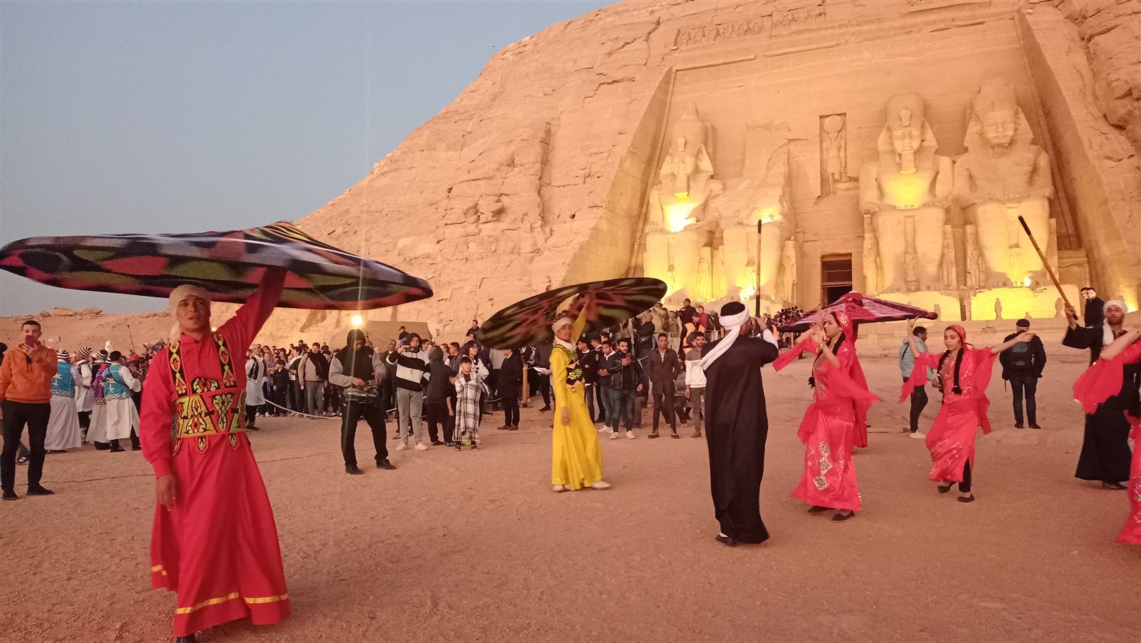 قدمت فرق مهرجان أسوان الدولي الحادي عشر للثقافة والفنون، صباح اليوم الخميس، عددا من فقراتها الاستعراضية المميزة، بمعبد أبي سمبل احتفالا بتعامد الشمس على تمثال الملك رمسيس الثاني بقدس أقداس المعبد، بحضور آلاف الزوار من السياح الأجانب والعرب والمصريين.