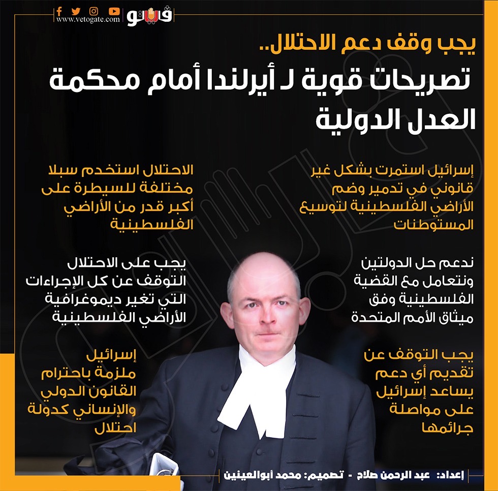 يجب وقف دعم الاحتلال.. تصريحات قوية لـ أيرلندا أمام محكمة العدل الدولية (إنفوجراف) الخميس 22/فبراير/2024 - 06:00 م 2/22/2024 6:00:13 PM تصريحات أيرلندا بمحكمة العدل، فيتو عبدالرحمن صلاح شارك طباعة 18 حجم الخط شارك طباعة محكمة العدل محكمة العدل الدولية غزة قطاع غزة فلسطين إيرلندا ممثل أيرلندا بمحكمة العدل