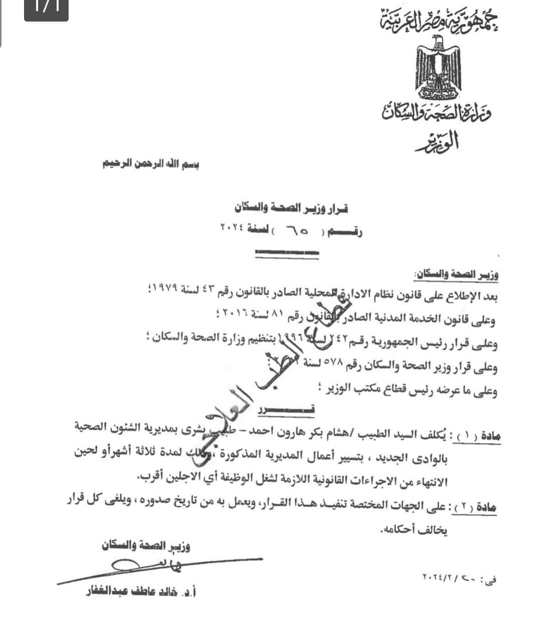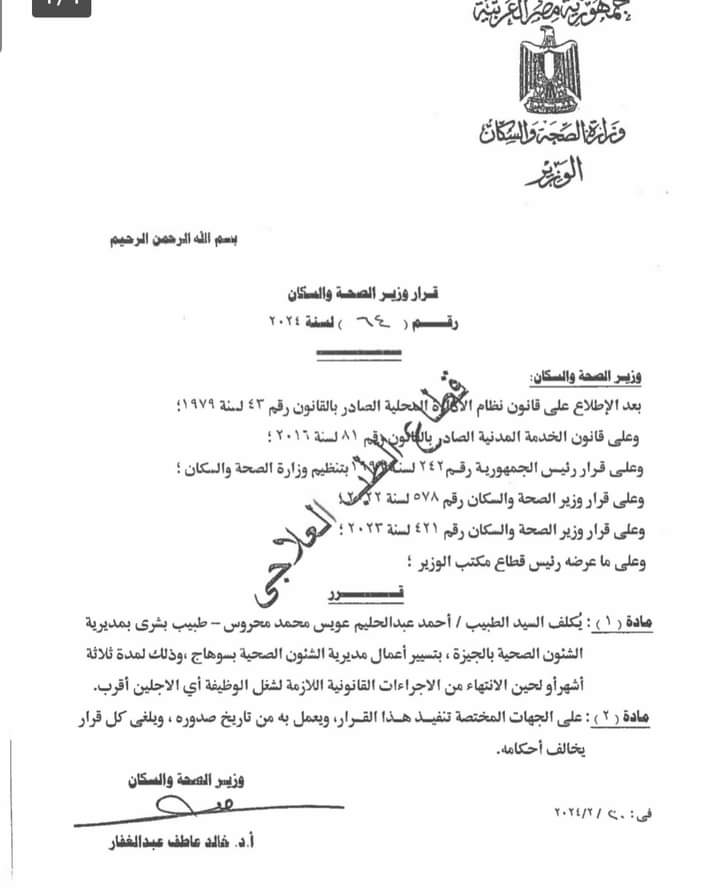 كما قرر الدكتور خالد عبد الغفار وزير الصحة والسكان، تكليف الدكتور أحمد محروس، مديرًا لمديرية الشئون الصحية بمحافظة سوهاج اعتبارًا من اليوم الخميس 22/2/2024.