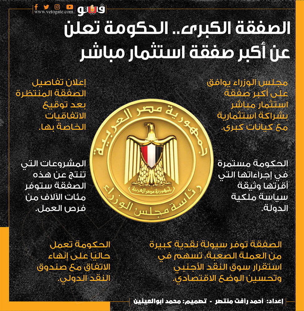 الصفقة الكبرى.. الحكومة تعلن عن أكبر صفقة استثمار مباشر (إنفوجراف) الخميس 22/فبراير/2024 - 06:04 م 2/22/2024 6:04:09 PM مجلس الوزراء، فيتو أحمد رأفت منتصر شارك طباعة 18 حجم الخط شارك طباعة أكبر صفقة استثمار مباشر الصفقة الكبري مجلس الوزراء قرارات مجلس الوزراء اليوم