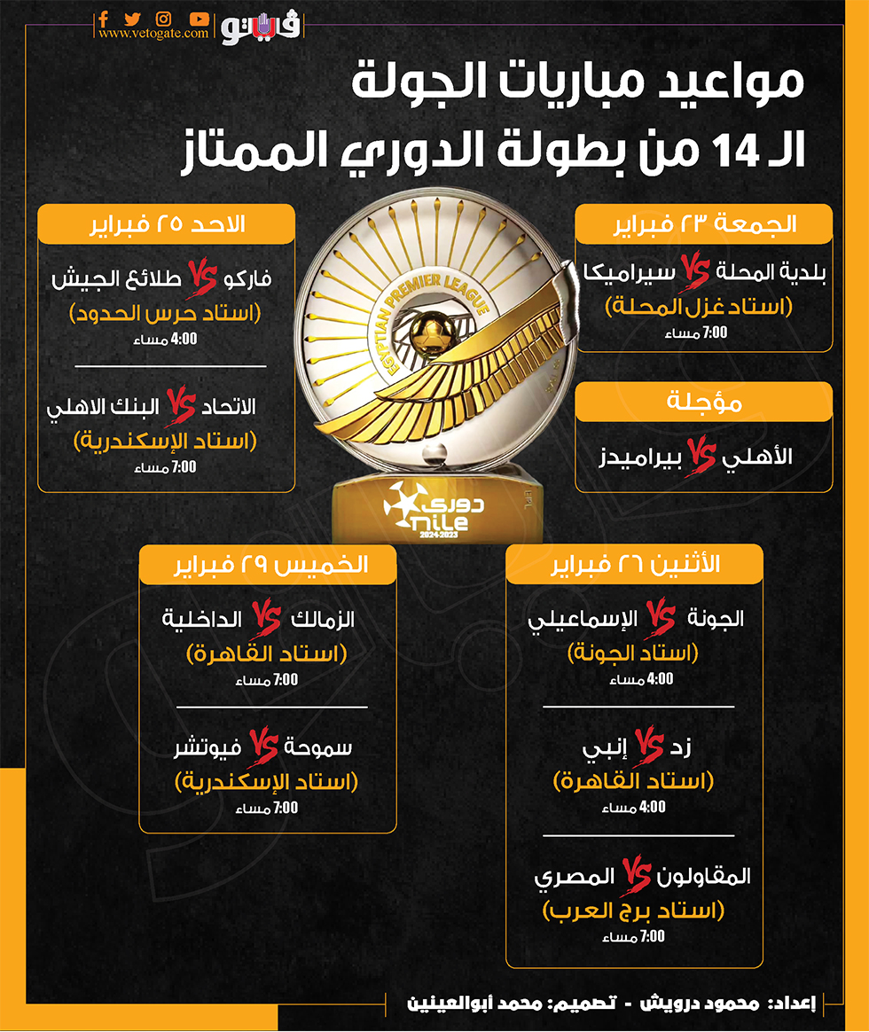 مواعيد مباريات الجولة الـ 14 من بطولة الدوري الممتاز (إنفوجراف) الجمعة 23/فبراير/2024 - 11:00 م 2/23/2024 11:00:32 PM الدوري المصري، فيتو محمود درويش شارك طباعة 18 حجم الخط شارك طباعة الدورى المصرى الممتاز بلدية المحلة ضد سيراميكا الاهلي ضد بيراميدز الزمالك ضد الداخلية المقاولون ضد المصري الجونة ضد الاسماعيلي بلدية المحلة الدوري المصري