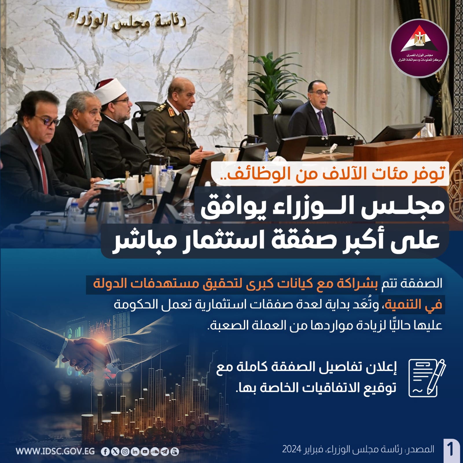 نشرت الصفحة الرسمية لمركز المعلومات ودعم اتخاذ القرار بمجلس الوزراء على موقع التواصل الاجتماعي "فيسبوك" إنفوجرافا جديدا تحت عنوان (توفر مئات الآلاف من الوظائف..مجلس الوزراء يوافق على أكبر صفقة استثمار مباشر)